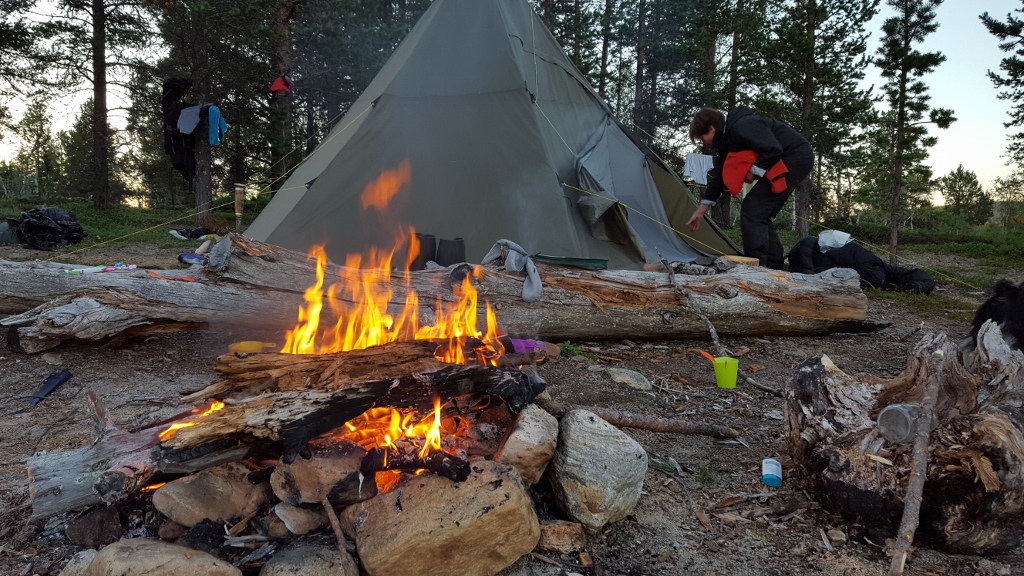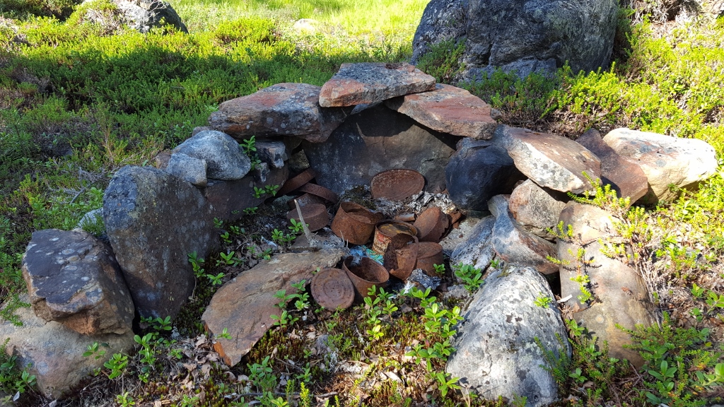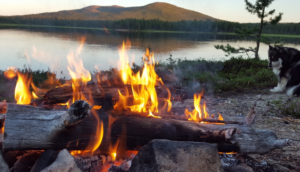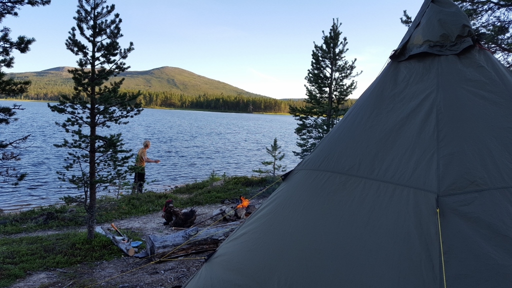 Ainoa miinuspuoli tässä maailman kauneimmassa leiripaikassa on muurahaiset, joita viilettä joka puolella. Jouduimme siirtämään kodan aivan tulipaikan taakse, koska metsässä muurahaisia oli tuhottomasti joka puolella. Leirin pystytyksen jälkeen kokeiltiin kalastella lähirannat ilman tulosta ja marssin yksin kohti Vuorhajärveen laskevaa jokea. Siellä oli hyvin varovainen syönti helteessä, mutta onnistuin nappaamaan pari mukavan kokoista ahventa ja karkuuttaamaan useammankin rannan heinikoihin. Sain vielä yhden harjuksen siten, että kahlasin reisiä myöten järveen ja heitin pienimmän lippani niin pitkälle kuin sain ja aivan ulommaiselta sektorilta nappasi pienehkö harjus. Ilmarilla oli vieraillut useampikin hauki, jotka kuitenkin päästettiin takaisin, koska kenelläkään ei tehnyt haukea mieli juuri sillä hetkellä. Tyhjenneltiin tulilla Katjan kanssa pieni minttupullo viimeisen illan ratoksi ja pelailtiin vielä korttia jonkin aikaa. Sovittiin jo illalla, että herätään hieman aiemmin, koska viimeiselle päivälle tulee pitkä ja kuuma patikka suhteellisen raskaassa maastossa. |