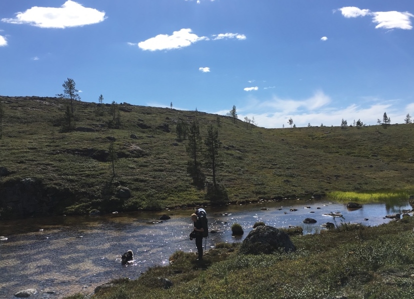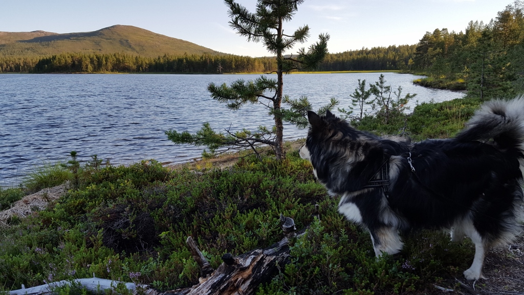 Lounaan päälle nukuimme taas tunnin verran puiden varjoissa makuualustojen päällä. Katjalta otetiin painoa pois rinkasta ja jaettiin niitä muiden rinkkoihin. Jalat oireili polvista aina etenkin laskeutumisten yhteydessä. Ylös Vuorhavaaralle kapuaminen oli hengityksen päälle käypää hommaa ja askel pidettiin lyhyenä. Lähtiessämme laskeutumaan kohti Aittajärven hiekkarantaa pölähti edestämme metsoparvi lentoon ja Ruusalle taas kamalat hepulit päälle. Haukku oli pikemminkin kimahduksia, joita kuulee lintukoirilta, ei Suomenlapinkoirilta. Liekkö metästysviettiä tässä paimenessa. Aittajärvi ilmestyi parin lammen kierron jälkeen ja tuttu leiripaikka oli ennallaan, jopa vanha suuri pahka oli yhä rannassa kokonaisena. Otettiin kisat kuka viimeisenä uimassa ja Katja taisi hävitä tämän erän. Lämmintä vettä ja hiekkapohja. |