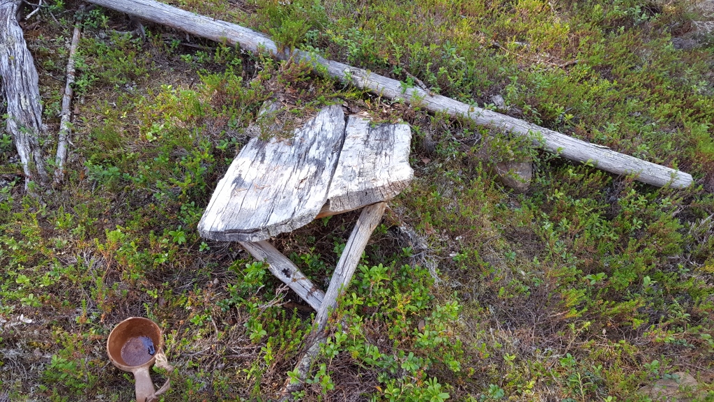 Laskeuduimme alas laaksoon sivupurolle, joka yhtyy varsinaiseen laaksonpohjapuroon ja satuimme suoraan paikalle, jossa joku on vuosia sitten kokeillut kullanhuuhdonnan autuutta. Paikan jälkien perusteella enemmän on kyllä nautittu viinaksia ja säilykkeitä. Kultapurkkikin oli tyhjillään kivenkolossa. Kaivanto näytti siltä, että korkeintaan viikko siinä on tongittu puron penkassa. Jonkinlainen rännintapainen oli tuotu paikalle ja penkit ja pöytä tehty ilmeisesti aikomuksen oleilla pidempäänkin. Liekö tullut viinojen loputtua äitiä ikävä. |