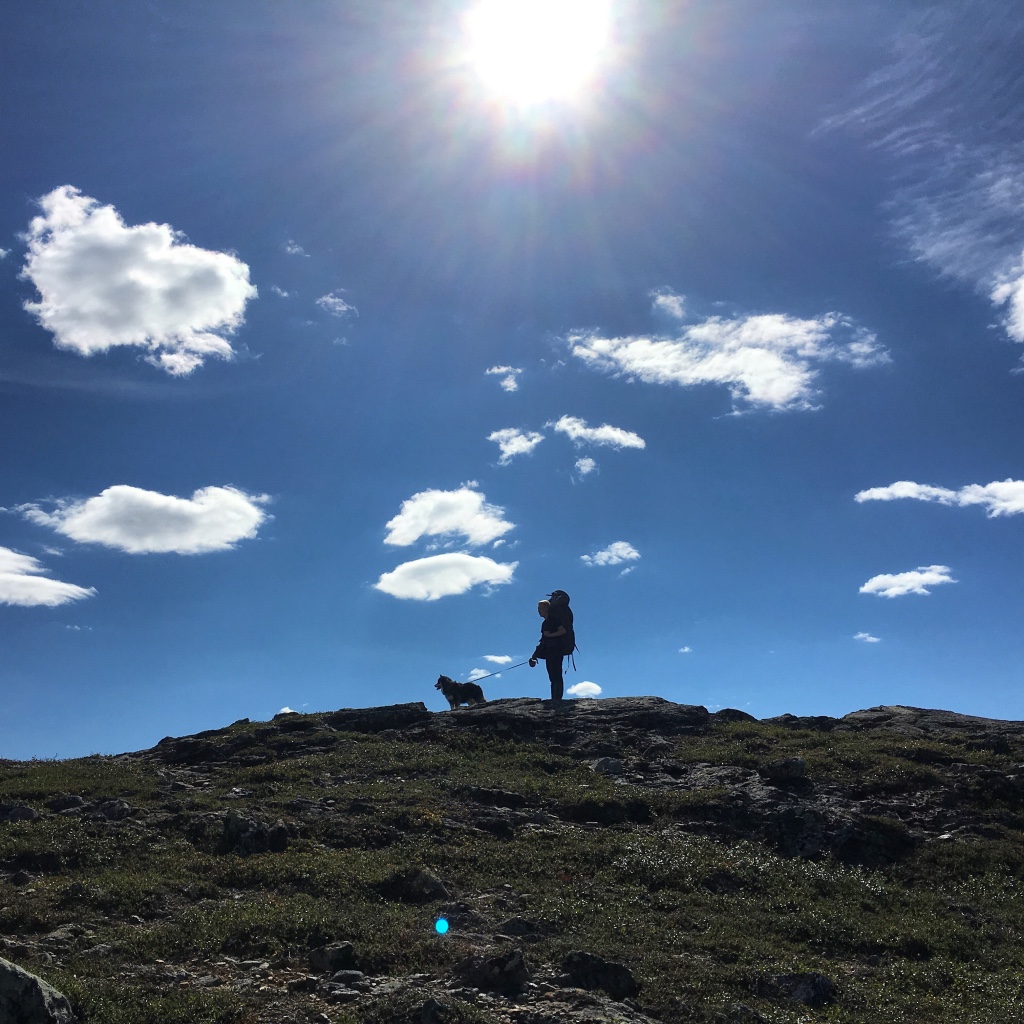 Suunnattiin askeleet Jäkäläpään huipun oikealta puolelta kohti Vuorhavaaran takana sijaitsevaa Aittajärveä nousten ensin puurajan yläpuolelle. Nousu oli niin raskaan oloista siinä helteessä, että ensimmäinen repputauko pidettiin jo kilometrin kävelyn jälkeen Ruusankin läähättessä kieli pitkällä. Tauon jälkeen maakotka ilmestyi kaartelemaan Vuorhapään laaksoon, mutta katosi sen verran nopeasti liian kauas, että olisi ehtinyt kunnon kuvia saamaan. Jäkäläpään kallioreunaisella itähuipulla pidettiin kuvaustaukoa jonkin aikaa. |