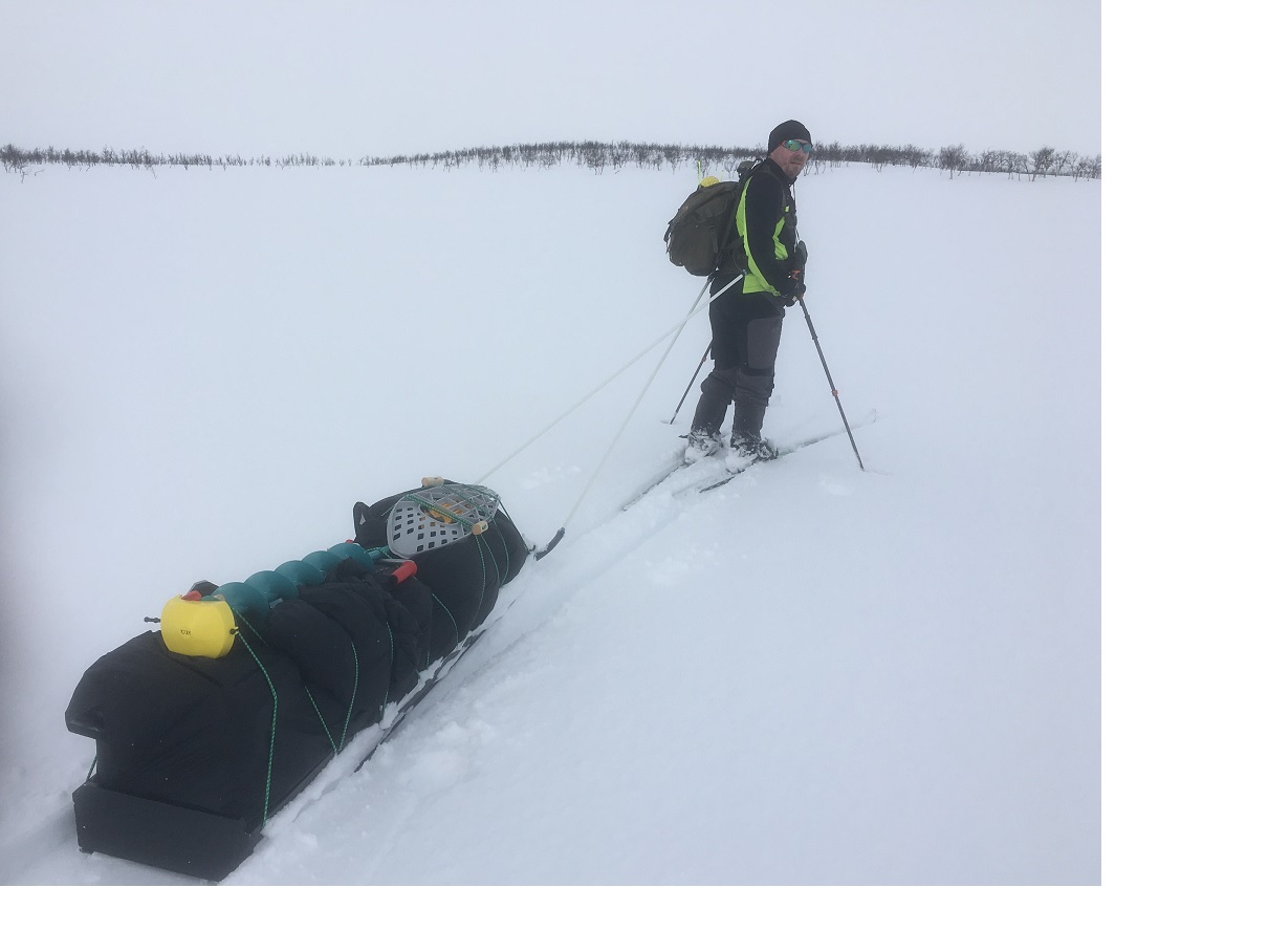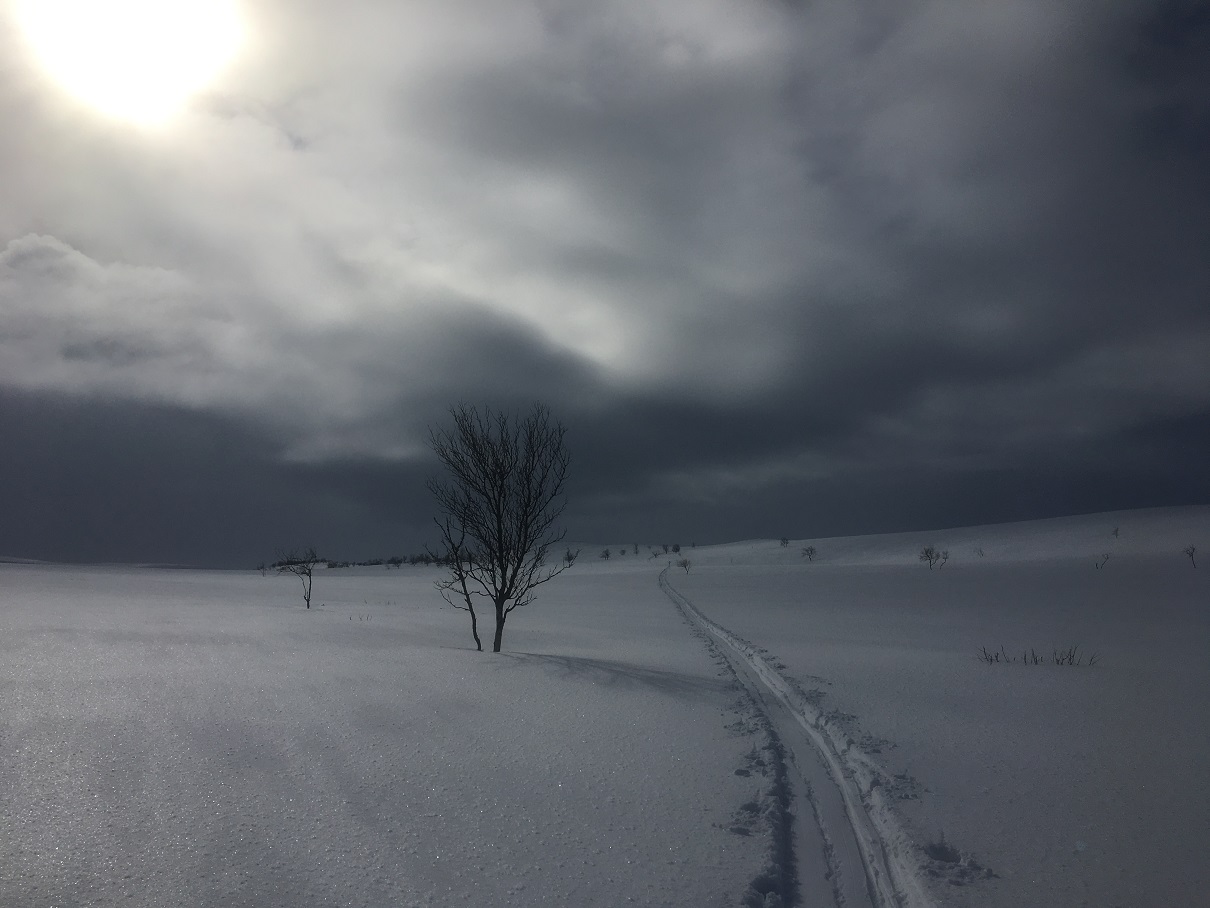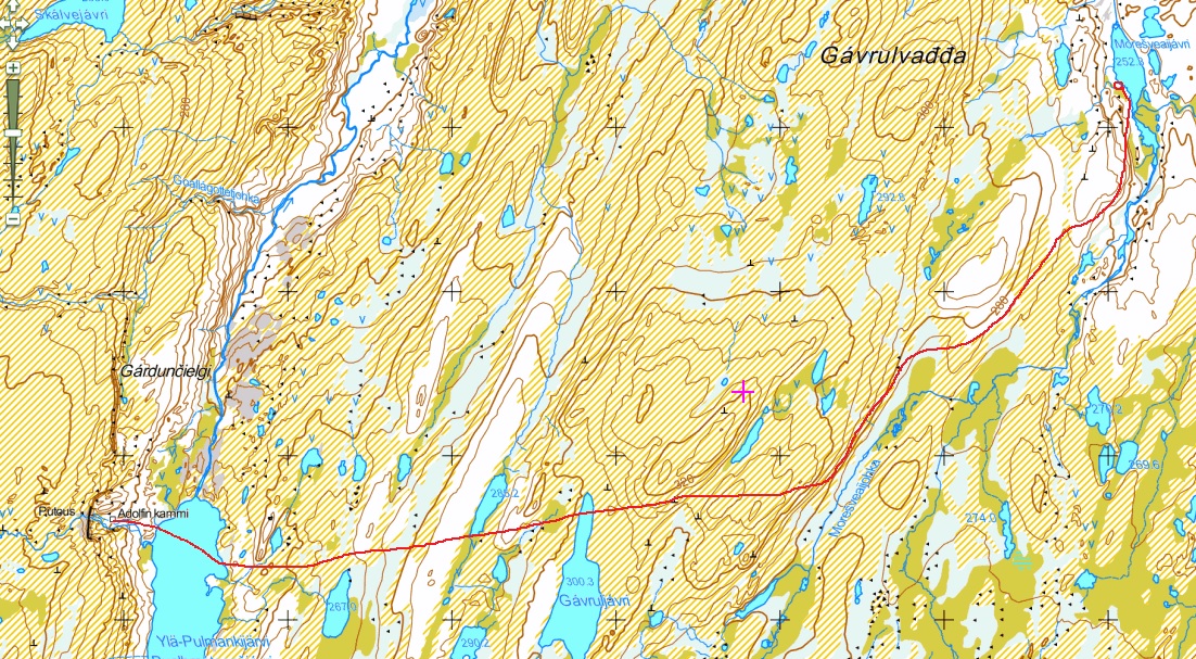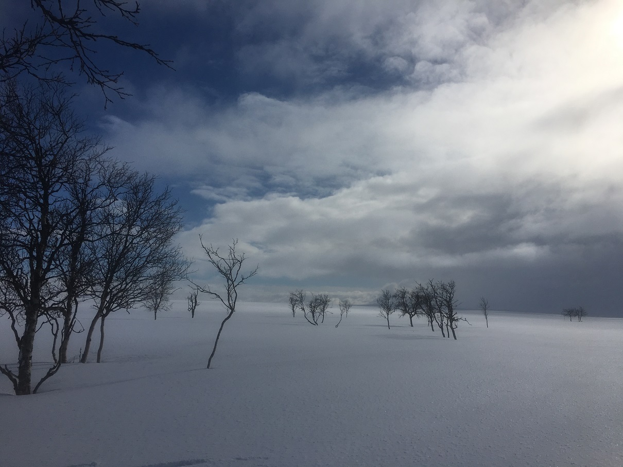 | | Pulmankijärvestä lähtevän joen tienoo on vaarallinen paikka talvellakin tuli varoituksen sanana edellisenä päivänä ja kyllähän se tummemmalta näytti aika pitkällekin järvelle päin kuin muu alue. Niinpä oikaistiin suoraan järven yli kammilta laskiessa kiertäen edessä oleva töppyrä oikean kautta. Reitti Gavruljärven Pohjoisnurkkaa kohti oli ylenevää maastoa peräjälkeen suon ja koivikkopenkereen vaihteluina. Tunnin taaperruksen jälkeen olimmekin taas puuttomassa tunturissa ja kuinka ollakaan keskellä murkua jälleen. Hieman vajaa sata nousumetriä takasin märän paidan selkämyksen ja navakaksi yltynyt tuuli toi kylmänväreet, joten suuntasimme rinteeltä alemmas Moresvaijokivarteen tauon pitoon. Lounaaksi oli nyt vain läjä näkkäreitä metukalla, koska päivämatka oli suhteellisen lyhyeksi suunniteltu. Kuuma mehu teki hyvää ja taas aurinko tuli tauon ajaksi lisälämmikkeeksi esiin pilvien takaa. Näkymä moresvaijokilaaksosta Itään ja Etelään on kuin lumipeittoista Saharaa tuijottaisi. Aivan tasaista valkoista maisemaa kilometrikaupalla. Me otettiin kuitenkin suunnaksi Moresvaijärvi Pohjoisessa, jonne oli helppo hiihdellä palsasuon tasaista lumikantta pitkin. Loppupätkällä seurattiin jokiuomaa ja yksi mukava jyrkempi laskukin osui reitille. Moresvain osin romahtanut kammi näkyi vastarannan kukkulan päällä ja me löimme oman majoitteemme suoraan toiselle rannalle mukavaan koivikkoon. |