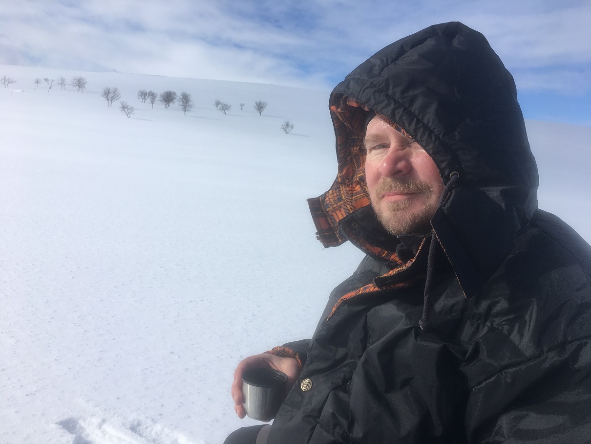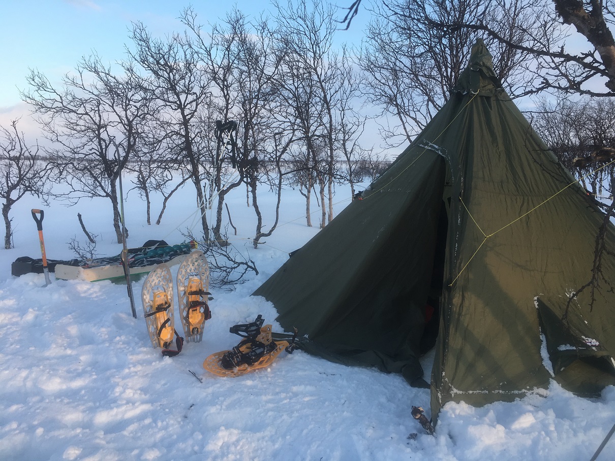Illan mittaan järven takaisen harjun viertä kulki useampi kelkka reki perässään ilmeisesti porojen rehua lastinaan. Osa kulki edelleen eteenpäin toisten noustessa suoraan Bealljegasvaddalle. Pitkänperjantain ratoksi istuskeltiin tulilla niin pitkään kun nuotio antoi mukavasti lämpöä ja siirryttiin sitten kotaan lämmittimen mukavasti jatkaessa nuotion virkaa. Suunnittelin seuraavan päivän reittiä Tshaarajärven tuvalle ja ajatuksena oli hyödyntää poromiesten kelkkauraa alkumatkasta. Myös Moresvain kammia oli tarkoitus käydä kurkistamassa. Pakkanen tuntui kirivän yön lähestyessä ja karvahattu päässä nukkumaan. | ||