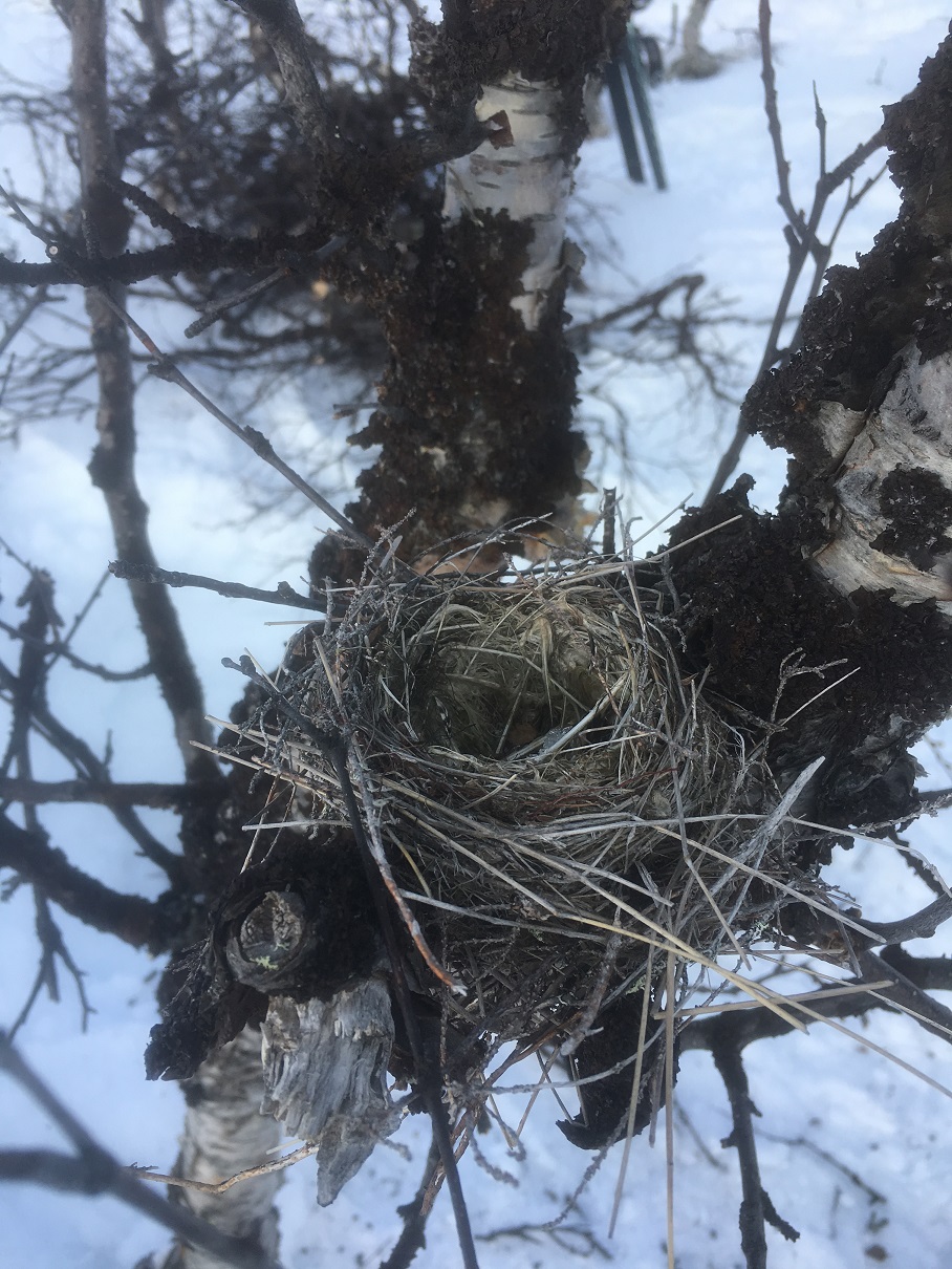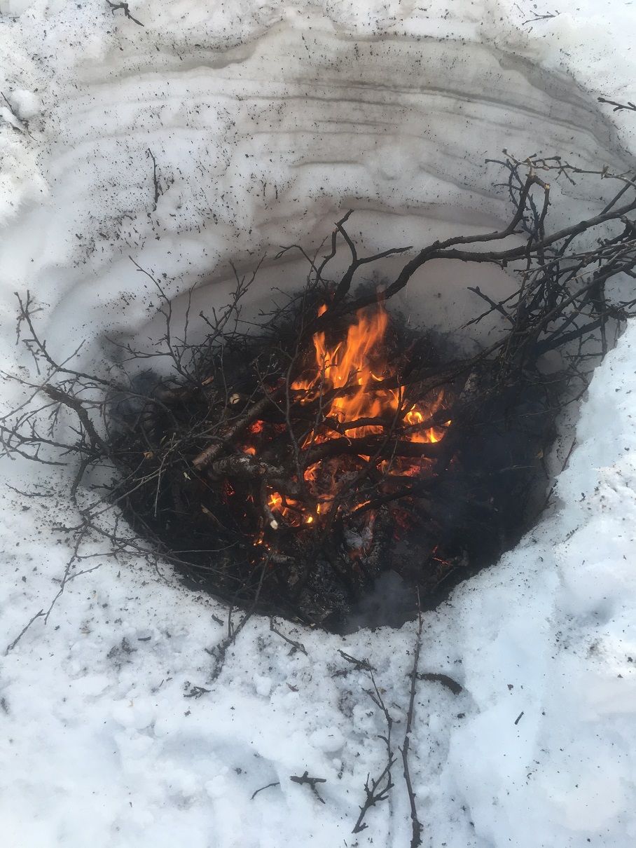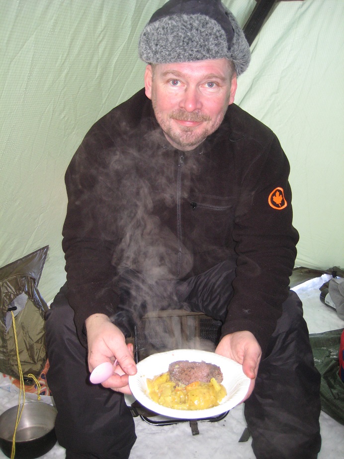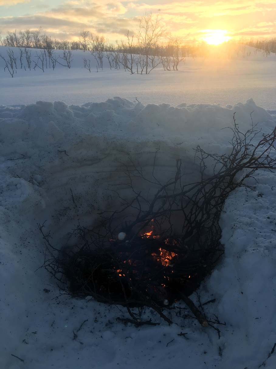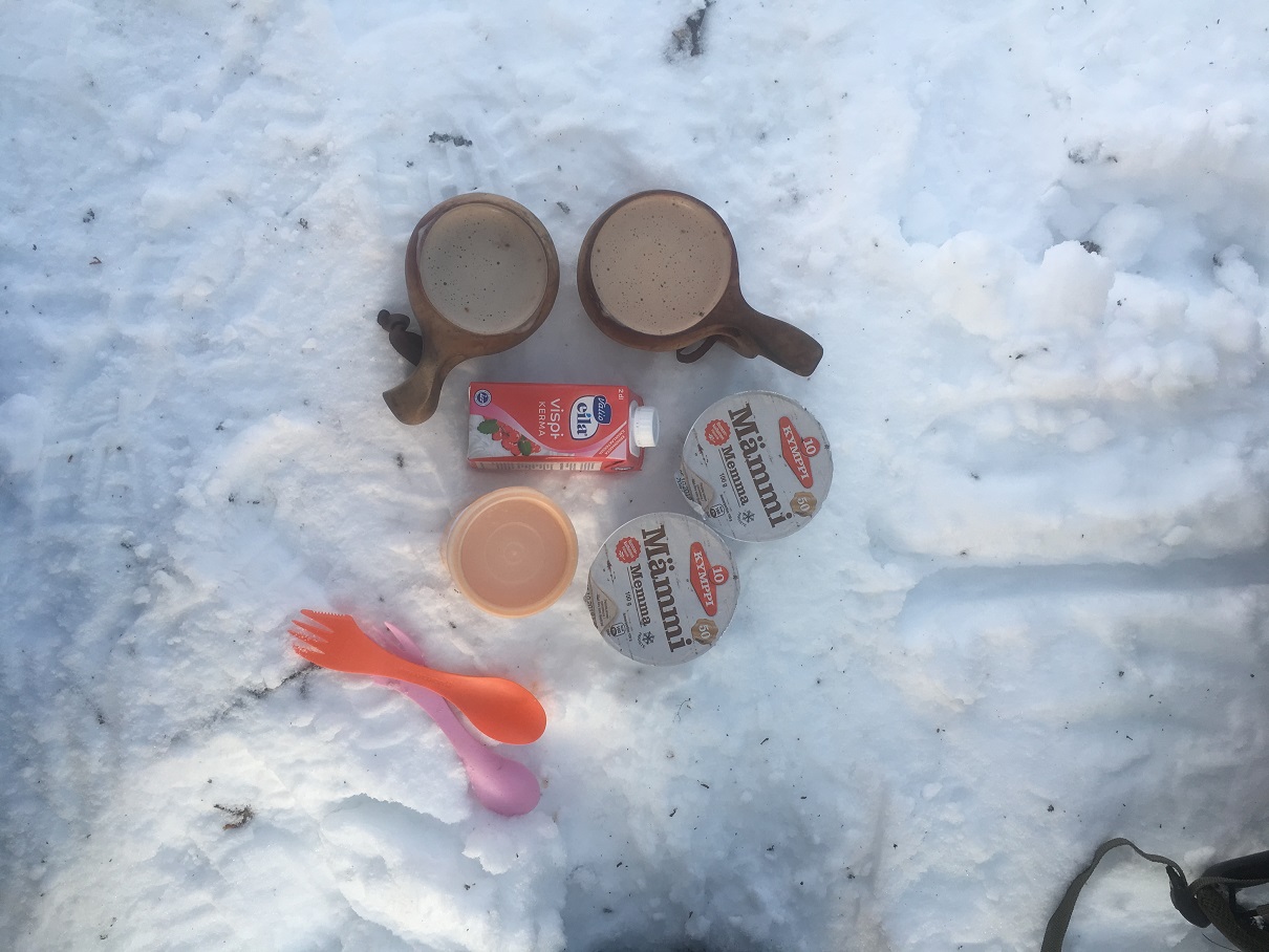 Olin etukäteen ajatellut, että joen leventymässä olevassa "järvessä" on pakko olla kalaa ja varasin tämän iltapäivän ja illan pilkkimiselle. Laitettiin kota vauhdilla pystyyn ja tein Katjalle nuotiotarpeita ison läjän Pääsiäiskokkoa varten. Täpinöissäni suuntasin lumikengät jalassa, kaira ja lumilapio olalla, kohti järven keskustaa auringon paistaessa täydeltä terältä. Ensimmäinen reikä ja mutainen pohjanäyte. Seuraavat kuusi reikää ympäri järveä ja sama homma, eli ei vettä missään. Onneksi oli pilkkirepussa kylmä olut, koska sen lisäksi, että oli karmea hiki uurastuksesta, niin oli harmituskin melkein tapissaan. Marssin takaisin leiriin, jossa Katja viritteli nuotiota metriseen hankeen kaivettuun kuoppaan. Jokainen, joka on joskus kokeillut tehdä isoja tulia tuoreesta koivusta syvään lumikuoppaan voinee samaistua pieneen tuskastumiseen. Tuli roihahtaa niin pitkäksi aikaa kun on pientä risua poltettavaksi, mutta sammua tupsahtaa varsinkin jos ei ole tuulinen keli. Pari tuntia ruokittiin tulta, jotta saimme kunnon nuotion palamaan roihuten. Monttuun tuulen suuntaan kaivettu oja olisi varmaan edesauttanut hapen saantia palamiselle. Lämmitimme nuotiolla eiliseltä ylijäänyttä perunaporkkanapaistosta ja pannulla käristyi maukkaat sisäfilepihvit. Runsaasti kastiketta lisukkeeksi ja viiniä kyytipojaksi. Jälkiruoaksi oli kuljetettu mämmikipposet, jonka päälle kermaa ja sokeria, sekä terästetyt Capuccino-kahvit vielä kuksasta perään. | ||