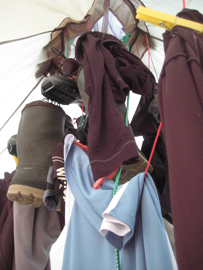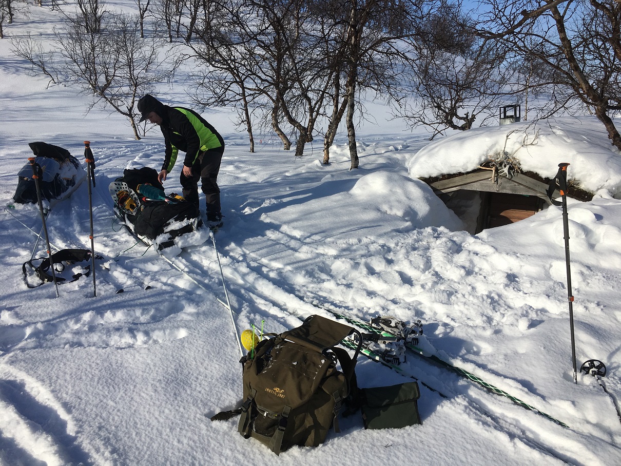 Aatun kammissa nukutti makeasti ja osasyynsä oli pitkään venähtäneessä illassakin, joten kello kävi yhtätoista kun sain kammettua itseni laverilta. Laittelin tulet kaminaan tai yritin, koska puut oli aika kosteita ja en raaskinut käyttää viimeisiä kuivia puita. Pilkoin retkikirveellä ohutta koivutikkua ja lopulta rätisi taas tulet lumensulatukseen. Tein vielä lisää puita ja pistin osan ylälaverille seinää vasten kuivamaan. Tankattiin nestettä enemmän kuin aikaisempina aamuina, koska nestehukkaa oli ollut molemmilla havaittavissa hiihtopäivien aikana. Tukeva aamiainen ja perusteellinen kammin siivous a'la Katja sillä välin kun kannoin meidän rojuja pihalle ja edelleen ahkioihin. Kammi näytti jopa viihtyisältä siivouksen jäljiltä ja toivottavasti seuraava tulija sai kaminan pöhisemään helpohkosti.