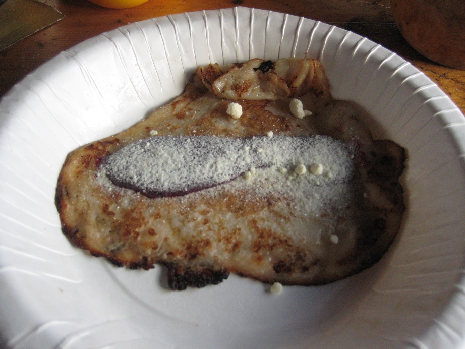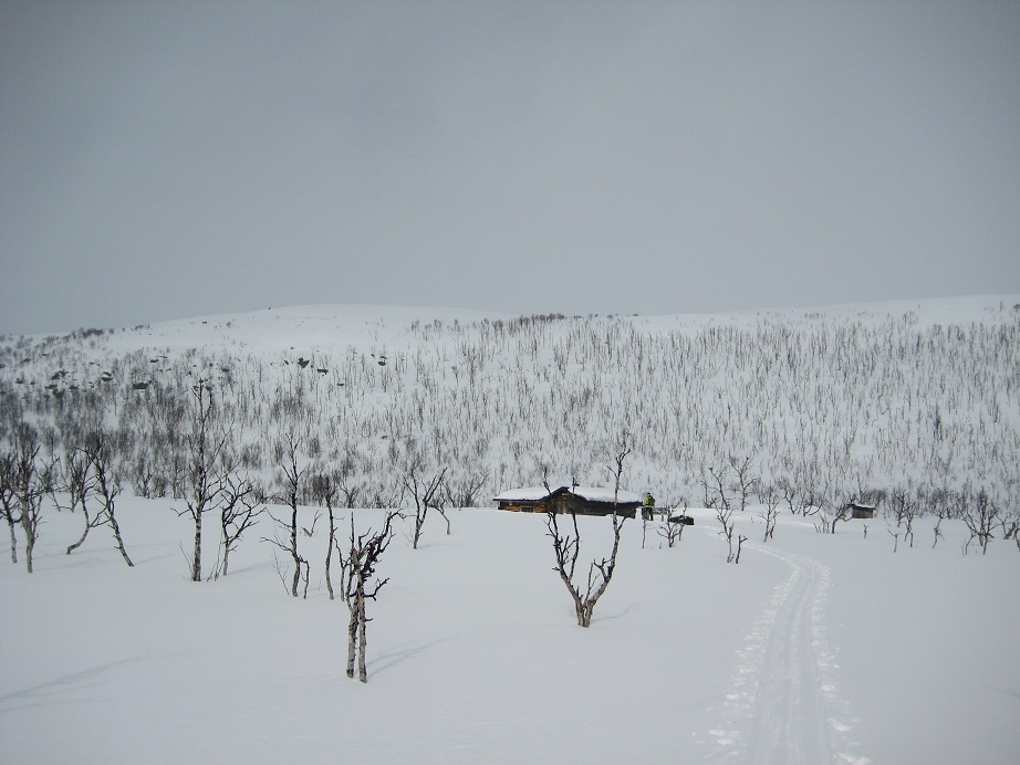 | Tupaan on rakennettu lisäosa, jossa on jätepiste, sekä puuliiteri ja jopa sisävessa mahdutettu saman katon alle. Puut on tuota säkeissä ja jos en ihan väärin katsonut niin Norjasta. Puut olivat todella kosteita ja kaminaan tulen loihtimiseen tarvitsin kasan alta löytyviä vanhoja kuivempia klapeja. Tupa pitää lämpöä huonommin mitä Tshaarajärven tupa, mutta ihan kohtuullisesti tämäkin kämppä lämpiää. Minulla oli vakaa aikomus käyttää koko iltapäivä pilkkimiseen, mutta keittolounaan päälle alkoi ramaisemaan ihan kunnolla ja varmasti reissun rasituksetkin painoi, joten eikun laverille vaakatasoon ja unta palloon. Nukuttiin sikeästi ja pitkään, joten kello oli herätessä sen verran, että hylkäsin pikkiajatuksen ja keskityttiin oleiluun ja ruuanlaittoon. Kun kaminassa oli kunnollinen hiillos, asettelin harjuksen kahden makkaratikun päälle siten, ettei foliopaketti päässyt palamaan puhki kaminan vedossa. Noin viisitoista minuuttia ja harjus oli täysin kypsää syötävksi. Lisänä oli perunahiutaleista tehtyä muussia ja hollandaisekastiketta. Jälkkäriksi lettuja sokerin, hillon ja valkosuklaarouheen kanssa. Katja meni aiemmin jo nukkumaan, mutta minä tein muutaman mukillisen ja lueskelin taas koko vieraskirjatarjonnan läpi. Mukavia kertomuksia ja aika paljon vaeltajia Tsekeistä, Sveitsistä, Saksasta ja muualtakin päin Eurooppaa on löytänyt tiensä näille selkosille. Niitä miettin unten maille.