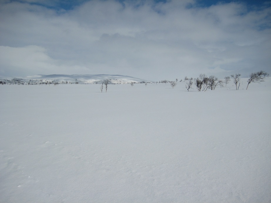 Lähdimme tuvalta puoli kymmenen jälkeen hiihtelemään ketun jälkiä seuraten talvireitin pohjaa samalla haeskellen. Uutta lunta oli satanut sen verran, että kelkan kovettama reitti oli aina välillä hakusessa, vaikka viitoitus näyttikin pääsuunnan kohti kelkkareitin yhtymäkohtaa. Kettu oli ovelasti tehnyt yllätyshyökkäyksiä koivujen juurelle riekkopaistin toivossa. Riekot ilmeisesti tekevät usein kieppinsä koivun läheisyyteen. Saavuimme kelkkauran varteen ja pidimme mehustelutaukoa ennen yhdeksän kilometrin helpompaa hiihtopätkää. Reitillä suksi luisti ihan eri malliin mitä kertaakaan aiemmin viikolla ja ensimmäistä kertaa alamäessäkään ei tarvinnut aina lykkiä lisää vauhtia. Parin tunnin jälkeen olimmekin jo kohdassa, josta hiihtoura erkanee kohti Tsuomaksen tupaa. Siinä näkyi edellisenä päivänä edellämme yksin hiihtäneen naisen ahkion jälki, josta olikin hieman vielä apua etenemiseen. Tupa on ovelasti piilossa lähes viimeiseen asti nyppylän takana ja jos ei tietäisi siellä tupaa olevan, niin ei varmasti sitä osaisi olettaa. Upea Tsuomasvarri nuosee heti tuvan takana muhkuraisine rinteineen avotunturiksi. Komealla paikalla on tämäkin autiotupa.
