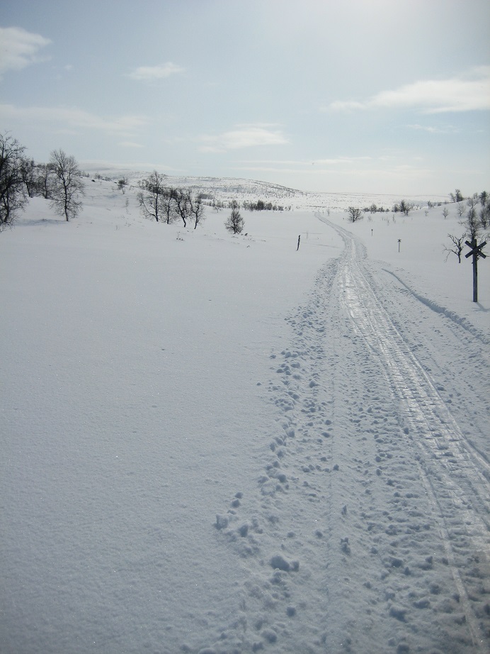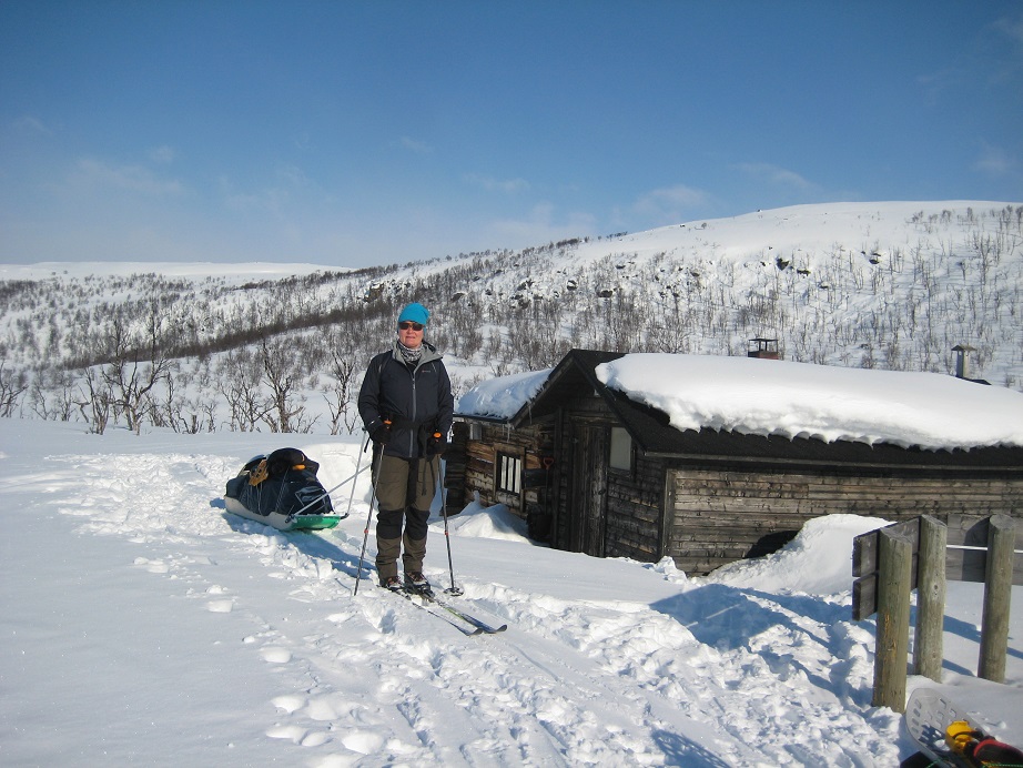 Aamulla tupa oli viilentynyt lähelle kymmentä astetta ja ensimmäisenä hommana oli loihtia kaminaan tulet. Siinä olikin tekemistä kun puut vaan sihisi, joten oli taas kaiveltava kasan alta kuivempaa sytykettä. Aurinko paistoi mukavasti, vaikka kello oli vasta kahdeksan ja alkoi osalta lämmittää tuvan seiniä. Polteltiin kaikki kaminassa palava roska ja loput pakattiin mukana lähteviin muovipusseihin, eli kämpän roska-astioihin ei meiltä jäänyt mitään. Ei pitäisi jäädä muiltakaan, koska ovat täytenä jaksaneet tuvalle jotain tuoda. Katja valmisteli vielä lounaskeiton varuilta ruokatermokseen kun ei osattu arvioida kuinka pitkään viimeistä pätkää hiihdellään. Syötiin tuhti aamiainen ja taisin ottaa kaikki kolme lämmintä juomaa, eli kahvin, kaakaon ja teen puuron päälle. Taas normirutiinit, eli kamat ekana pihalle, tuhkien tyhjennys, minä pakkaamaan ahkioita ja Katja siivoamaan tupaa. Vielä kaasuhana kiinni ja oltiin valmiina sujuttelemaan kohti Pulmankia. |