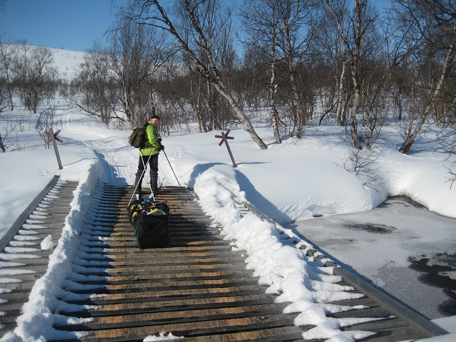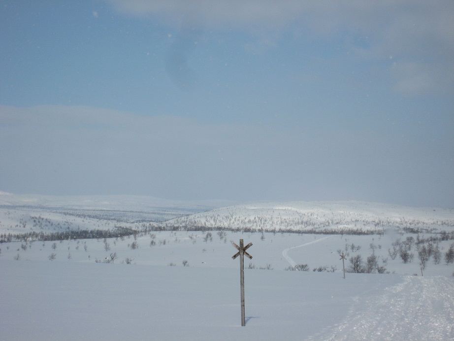 Tuntui, että lähes koko viikon olimme vain nousseet korkeusmetrejä ja aika lailla se piti paikkansakin. Nyt oli vuorossa sitten ansaittujen nousumetrien hyödyntäminen kun reitti alkoi laskeutua 243 metristä kohti Pulmankijärven 12 metriä. Välille mahtuu tietysti muutama nousukin, joista jyrkin on viimeinen Buollanvarrin rinteessä. Lumi oli peittänyt aiemmin auki olleen oikotien 128-lammen kohdalta Buollanvarrin Eteläpuolella, joten kiersimme virallista reittiä. Lasku alkaa mukavasti avonaisessa maastossa ja kelkkauralla vauhti nousi lähelle persiilleheittäytymiskynnystä, mutta pystyssä vielä pysyttiin. Sitten tuli hankalaa paikkaa, koska uran reunat oli suhteellisen korkeat ja uran vieressä puita. Laskimme siksakkia uran yli ja puiden väliin tähdäten. Kertaalleen Katja otti tuntumaa kelkkauraan takapuolellaan, mutta muutoin päästiin ilman havereita alas. Viimeinen lasku oli pomppuinen ja ahkio nyki ikävästi jokaisessa pompussa. 200 korkeusmetriä yhteen laskuun, eli tästä ei tulla ainakaan me aloittamaan ahkioiden kanssa kohti Tsuomasta. Vielä Pulmankijoen yli jäätä pitkin ja infopisteelle ahkiot parkkiin. Kävelimme kolme kilometriä hakemaan autoa ja ajoimme takaisin tavaroita pakkaamaan. Kello kävi lähellä kahta kun pääsimme pikaisen autossa nautitun keittolounaan jälkeen liikkeelle. Varattiin Saariselältä hotellista saunallinen huone, jossa olimme kuuden maissa. Kuukkelista hieman janojuomaa ja lakkahillomunkit mukaan. Illalla söimme pizzaa ja salaattia, mutta ei ne oikein tuntuneet pärjäävän erämaassa nautituille herkuille. unta ei tarvinnut houkutella saunomisen jälkeen. Seuraava päivä meni ajellessa hieman reilut tuhat kilometriä kotiin, jossa olimme yhdeksältä illalla. |