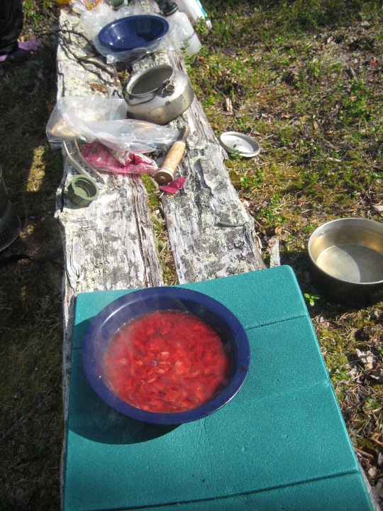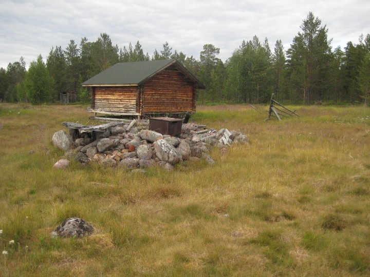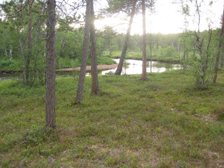 Kolmas päivä ja Katjalle vaikein kulkupäivä yleensä. Niinpä olinkin suunnitellut vaatimattoman 20 kilometrin reippailun Vaskojoen pohjoispuolelle asti..Totta puhuen reitti muodostui päivän mittaan itsekseen ja vaikka olikin aika rankka jotos, niin molemmat olimme reitinvalinnan ja yöpaikan kannalla. Yhytimme karhun jäljet ja jätökset poroaidan kupeesta matkalla kohti Vaskoa. Nousimme pahtavaaran rinnettä jonkin matkaa ennen laskettelua Vaskojoen varteen. Kuorttasuvannon alkupäässä keittelimme borskeiton tapaisen riisistä, kuivatuista vihanneksista ja meetwurstipaloista. Pyrimme keittämään pakissa mahdollisimman paljon, koska trangian menovettä oli vain litran pullo matkassa. Pystyttelin teltan sisäosan lounastaukoa varten, mutta jo pelkkä verkkokangas lämmitti sen minulle liian kuumaksi, Katja sen sijaan nukkui makoisasti pari tuntia. Kovin pitkältä tuntui marssi kuorttasuvannolta koskenniskalle. Samalla hämmästelimme metsikköä, jossa paksua mustaa naavaa kasvoi jopa tukehduttaen puiden muun kasvun. Onkohan kertomaa puhtaasta luonnosta vai jostain taudista ? Tätä näkyä on usean kilometrin matkan koskenniskalta Vaskojoen yläjuoksun suuntaan. Saavutimme vanhan pihapiirin iltaseitsemän aikoihin ja kohta Angelin tiekin tuli näköpiiriin. Paikallinen poromies tuli juttelemaan Vaskon varteen, jossa liottelimme varpaitamme ja tankkailimme vielä viimeistä siirtymää varten. Oli käynyt mönkijällä hilloja katsomassa kairassa, mutta yhtä laiha saalis oli mitä meilläkin. Muutamia raakileita näkyi, mutta yhtään syöntikuntoista ei viikon aikana löytynyt. Timo antoi luvan mennä hänen ja äitinsä pihapiirin läpi kohti Kurtojoen ylityspaikkaa, joka oli poroaidan vieressä vajaa kilometri Vaskon liittymäkohdasta ylävirtaan. Sen verran oli vettä, että kumpparit piti vaihtaa crocseihin. Pusikosta tarttui sitkeä ja tuuhea itikkaparvi matkaan hetkiseksi. Oikaisimme kankaan yli kohti Kurtojoen mutkaa, jossa on komea kelohirsihuvila. Emme ihan nurkalle telttaamme pystyttäneet, mutta liki pihapiirissä yön vietimme. Kävimme uimassa illalla ja yritin kalastellakin. Kalassa on noilla nurkilla käyty paljon, siitä kertoi vankat polut joen molemmin puolin ja niinhän siinä kävi, että suurin kala oli 9 cm pitkä tammukka, joka onneksi irtosi jo ihan itsestään ennen nostoa. Paikka oli todella viihtyisä ja illan hämärässä polttelimme tulia aika myöhään. Samalla vaihtui Lemmenjoen 1:100 000 kartta Muotkan uuteen retkeilykarttaan 1:50 000 ja tuntui ihan mukavalta katsella maastoa tarkemman kartan turvin. |