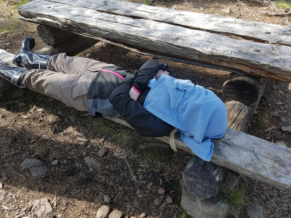 kunnioitettava tavoite kävellä reilut kolmekymmentä kilometriä tunturit kiertäen. Meille riitti kolmasosa tuosta. Katja kokkaili nuudelilounaan, jonka kylkeen syötiin pari makkaraa ja mummon pussukasta löytyneet piirakat kera munavoin. Perinteitä vaalien lounaan päälle koko porukka pötkölleen kuka minnekin, itse kellistin ruhoni ruokapöydän penkille.