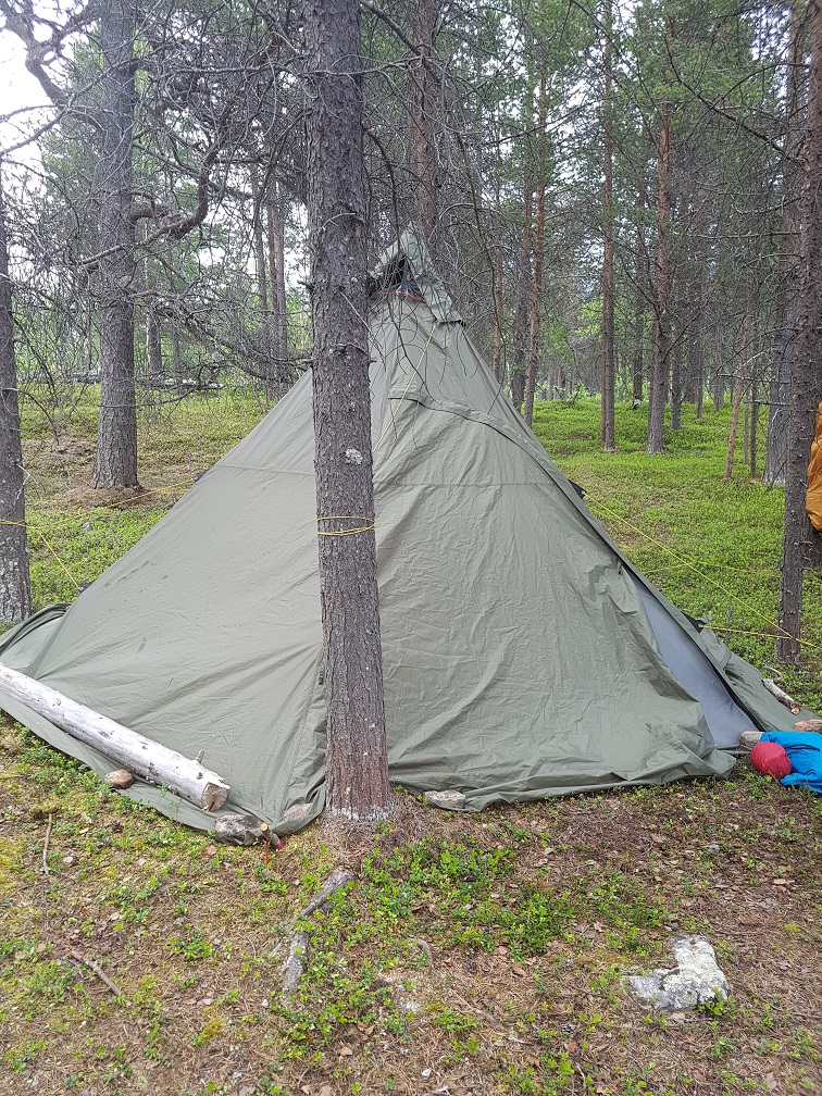 | Ajatuksissa oli kummitellut jo pidempään Lars Monsenin reissu samoille seuduille ja Ravadasjärvestä noussut iso taimen, joten heti kun oltiin hieman palauduttu marssista ja laitettu sekä kotateltta, että pienempi teltta pystyyn, siirryttiin järven rantaan heittelemään. Ensimmäinen heitto ja minulla iso taimen kiinni!. Taimen retuutteli itseään ilmaan hyppien ja niinhän siinä kävi, että kymmenen metriä ennen rantaa vielä yksi hyppy ja ravistus ja sinne meni. Iirikselle ostin uuden avokelan ja vavan ennen reissua ja Iiris sai pienen taimenen melkein heti oman tapahtumani perään. Laskettiin alimittainen takaisin kasvamaan ja lähdin poikien kanssa kiertämään järveä. Navakka itätuuli nosti aaltoja ja ajattelin, ettei tällä kelillä tapahtumia enää pahemmin tule. Olavi kuitenkin tartutti järven toisessa päässä suuren taimenen, mutta tällä kertaa ei kestänyt siima, joka napsahti poikki taimenen tempoillessa. Löysättiin molemmat jarrua ja yritettiin päätellä mikä olisi sopivin tiukkuus taimenen hypyille. Etelärannalta nousi useita kaloja, mutta kaikki olivat reilusti alimittaisia, joten käveltiin takaisin leiriin iltapuuhiin. Katja oli valmistanut suppilovahverorisoton Sherryllä, parmesaanilla ja voilla maustettuna ja voi pojat kun maistui hyvältä. Mummot asettuivat pienempään telttaan nukkumaan ja minä olin varannut heille Expedin untuva-alustat mukavuutta tuomaan. Loppuporukan kanssa nukuttiin Helsportin kotateltassa, johon viisi henkeä ja koira mahtuu ihan mukavasti. Keskisalkoa en kuljettanut mukana, koska painoa oli muutenkin pelkällä kankaalla neljä kiloa.