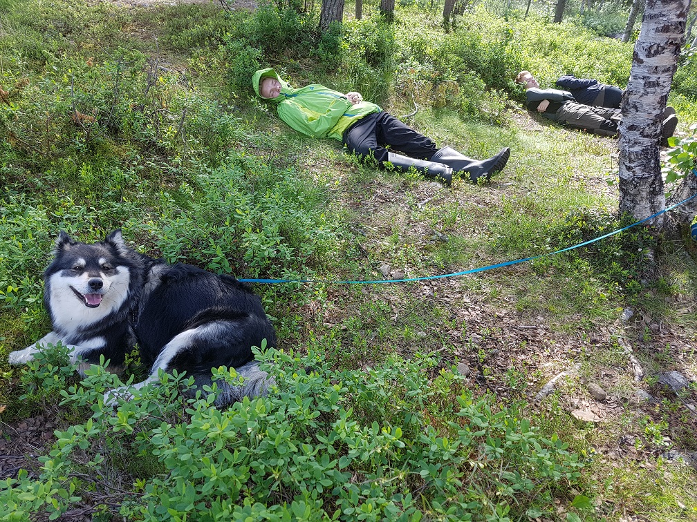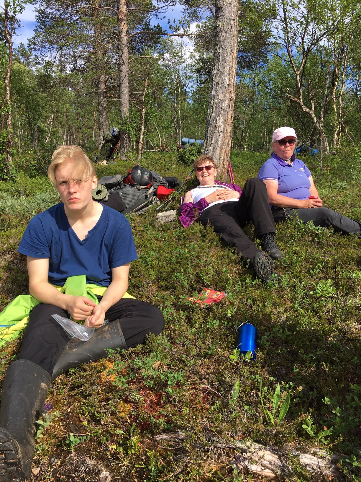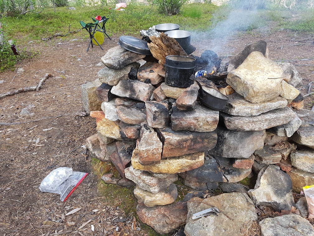 Ensimmäiset maistiaiset tulevasta saatiin heti kun noustiin rappusia pitkin mäen päälle ja rinkan paino realisoitui jokaisella askeleella. Mummoilla oli kävelysauvat, joista olikin paljon apua varsinkin hankalimmissa maastonkohdissa. Edettiin hissukseen välillä repputaukoja pitäen ja Ravadasnjargan tulipaikalle saavuttiin vajaan parin tunnin kävelyn jälkeen. Iiris ja pojat kävelivät jo hieman edeltä tulien tekoon ja loppuporukka pääsikin valmiille tulille istuskelemaan. Ilma oli lämmennyt reilusti päälle parinkymmenen ja paita oli märkänä jo lyhyenkin kävelyn jäljiltä. Tulipaikalle saapui kaksi päiväretkeläistä, joilla oli