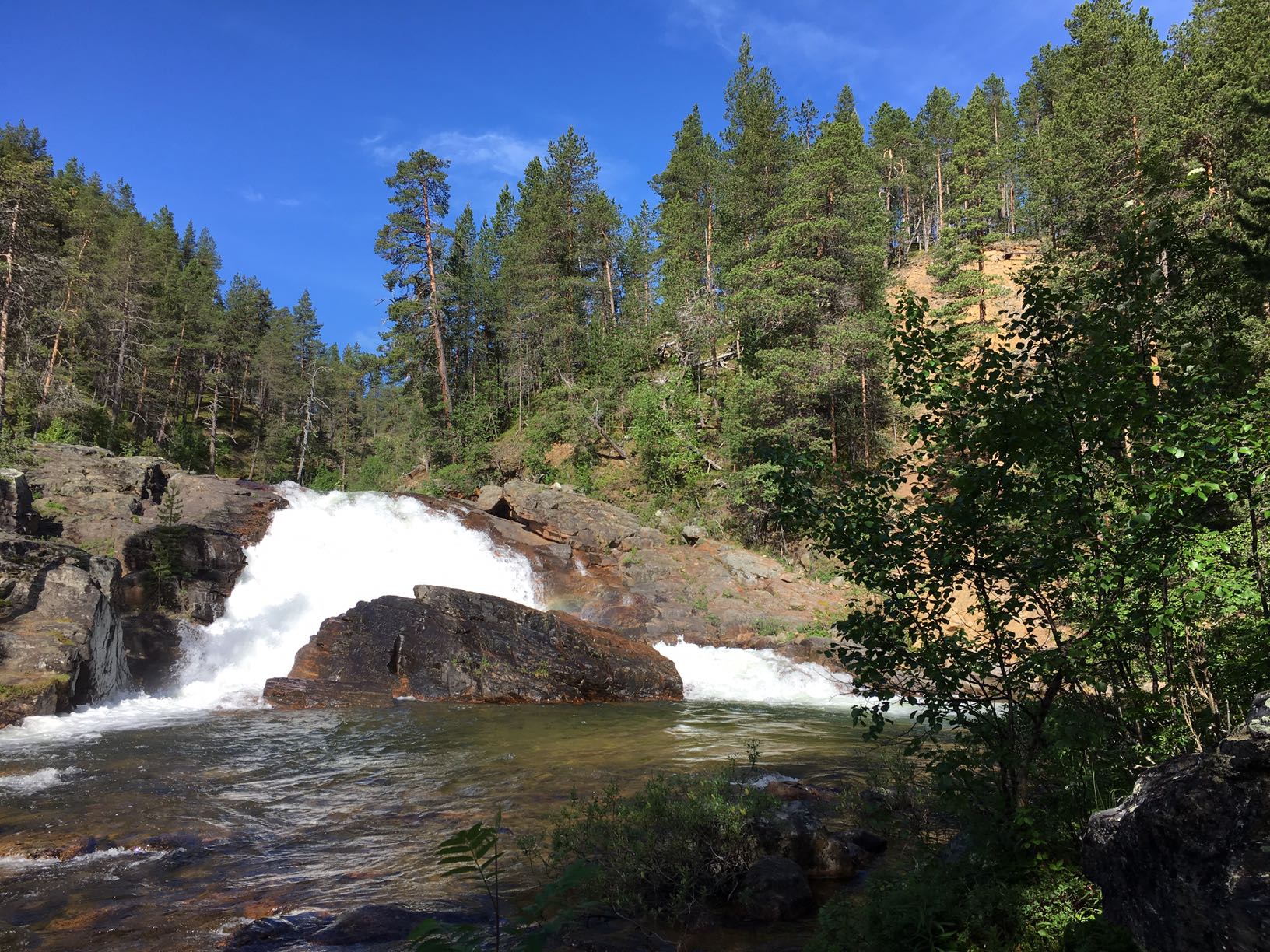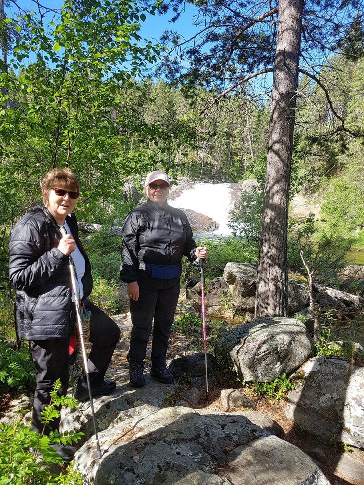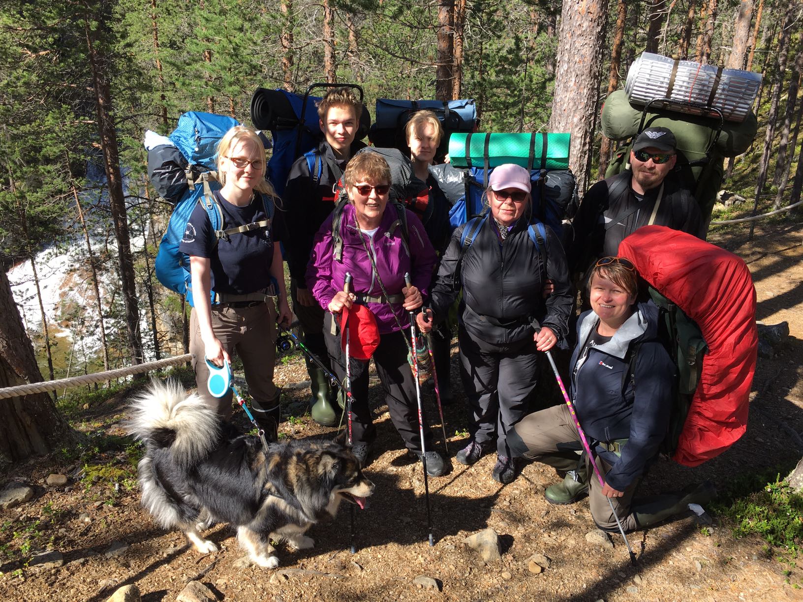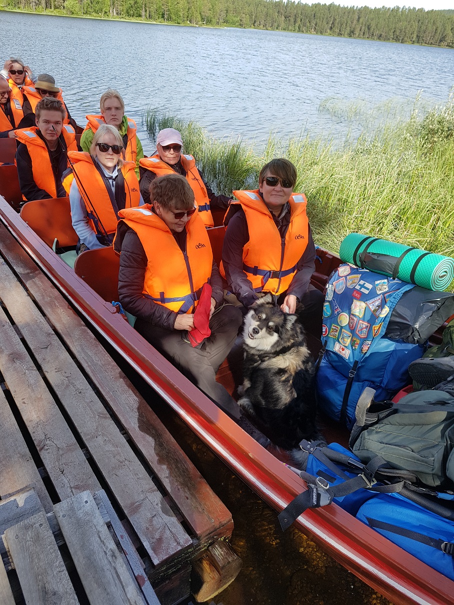 Tosi hyvä aamiainen olikin laitettu tarjolle. Hieman ennen kymmentä siirryttiin rantaan, jossa lastattiin seitsemän rinkkaa veneen keulaan ja istahdettiin itse penkeille kaksi rinnakkain. Nelitahtimoottorin matala murea ääni saatteli veneen matkaan ja järviosuudella tuuli puhalteli mukavasti ilman lämmetessä jo pariinkymmeneen. Jäimme kyydistä Ravadaskönkään laiturille osan jatkaessa vielä kohti kultasatamaa. Vesi oli paljon korkeammalla kuin normaalisti ja koskien kohdatkin päästiin ajamalla koko porukka kyyydissä. Ravadaskönkäästä pakolliset kuvat ja poseeraukset ennen patikoinnin alkamista. |