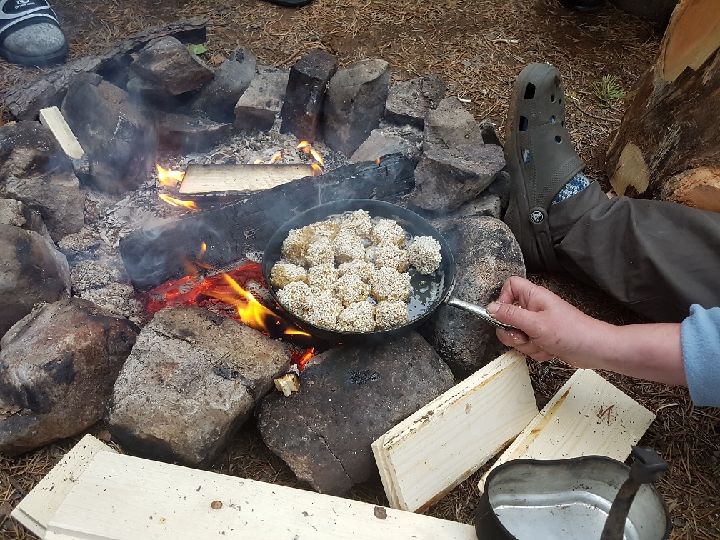 Anjalla oli vielä erittäin riittoisassa pienessä konjakkipullossa jokaiselle pieni lämmike, jotka nautittiin heti kun oltiin saatu tulet syttymään. Irmalla oli mukana kolme levyä tummaa suklaata, jota napsittiin pala palalta vähemmäksi. Teltalle ja kotateltalle ei ollut kovin monta sijaintivaihtoehtoa, joten pystytettiin ne liki vierekkäin rantatörmälle sateen kostuttamalle neulasmaalle. Valmiiksi kostea telttakangas oli hetkessä aika karun näköinen ilmestys. Pystytysurakan päälle kävin joessa pikaisella uintireissulla ja vesi oli ihan uimakelpoista, vaikka olisi luullut sen olevan jäätävän kylmää. Ehkä viilentynyt ilmanala vaikutti siihen myös. Iiriksen kanssa haettiin juomavettä Lemmenjokeen laskevasta sivujoesta, koska pääuoman vesi ei välttämättä sellaisenaan sillä kohtaa ollut juomakelpoista. Sitten käytiin Iiriksen kanssa kokeilemassa sekä pääuoman, että sivujoen kalantuloa, mutta hiljaista oli. Iiris sai pienen taimenen ja minä pienen harjuksen, jotka molemmat päästettiin kasvamaan kokoa. Vanha totuus taas pitää paikkansa, eli mitä enemmän on väkeä ja kalastajia, sitä vähemmän saalista. Muut valittelivat samaa, eli mittakalat loistivat poissaolollaan Lemmenjoella. Viimeisen maastoillan ruokana oli perunamuussia, johon sotkettiin jauhelihaa sekaan. Sen päälle Katja paistoi vielä nuotiolla kasvispihvin tapaisia palleroita leivitettyinä ja nehän olikin oikein makoisia. Istuskeltiin tulilla illan pieneen hämärään saakka ja pelailtiin muutama kierros China handia korteilla. Nukkumaan puolen yön hujakoilla. |