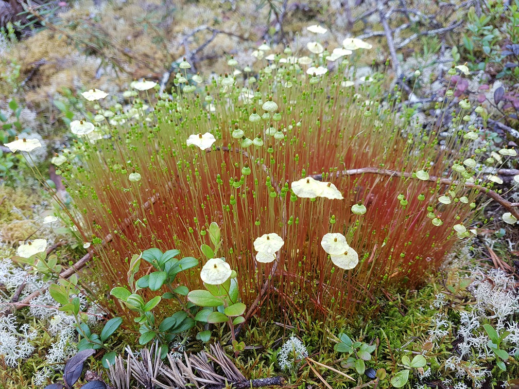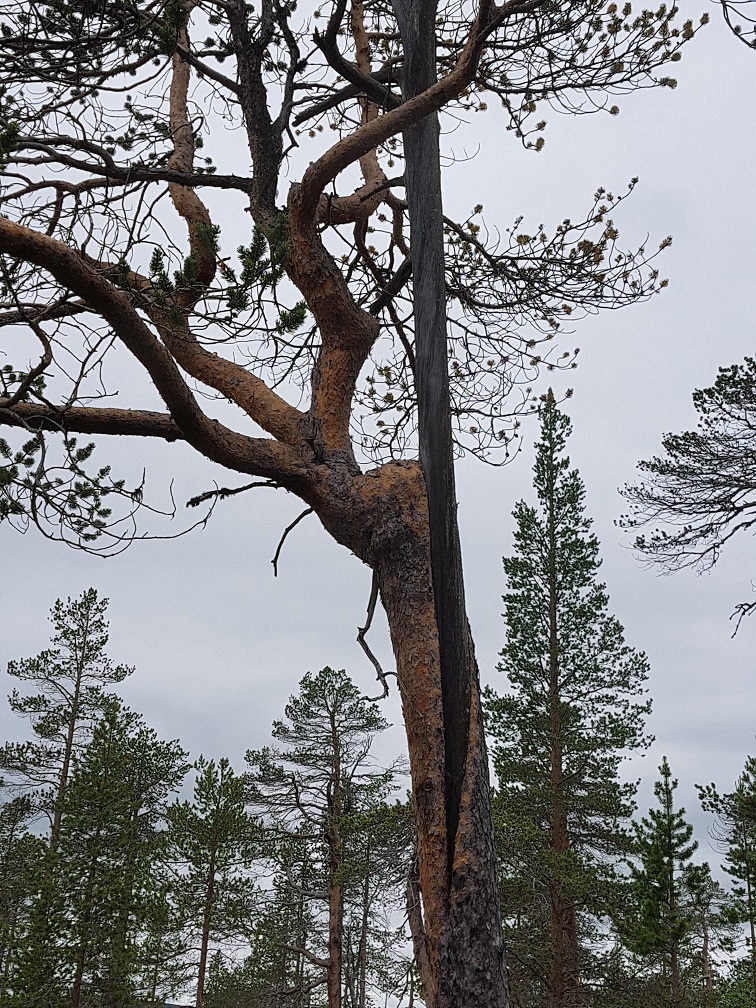 Olin ladannut maastokarttasovelluksen esiladatun kartan oikeastaan juuri tätä päivää varten, koska matkalle osui vaikesti ylitettäviä soita ja puroja, joita ei 1:100000 kartalta kunnolla pystynyt havaitsemaan. Aamun pakkailujen jälkeen otimme kompassisuunnalla Koilliseen kapeimman kohdan vaikeakulkuisen suon yli. Sateiden takia pieni puro ei nyt ollutkaan pieni ja itse puron lähestyminenkin oli haastavaa. Etsin jonkin aikaa kohtaa, josta Anja ja Irma pääsisivät uomien lähelle kastelematta kenkiään. Kaadoin muutaman rämekoivun astinsijoiksi ja tein parista rungosta sillan matalamman sivuhaaran yli. Kaikki pääsivät suuremman puronhaaran lähettyville, jossa jouduin kaatamaan useamman koivunrungon päästäksemme yli. Virta oli todella voimakas ja puro vaikutti syvältä, joten Ilmari rohkeana meni ensin minun auttaessa yli ja siirsimme sitten kaikkien rinkat ja muut tavarat Ilmarin ollessa vastarannalla apuna. Iiris meni seuraavana ja sitten Olavi Ruusan kanssa. Ruusa oli tosi reipas ja ylitti hitain, mutta varmoin askelin puita pitkin vuolaan virran. Mummot tulivat myös hienosti yli ja päästiin jatkamaan matkaa eteenpäin. Harmi kun tämä ylitys jäi kuvaamatta, mutta oli sen verran tohina päällä, että kukaan ei ehtinyt kaivamaan kameraa esille. Etenimme upean vanhamäntyisen rinteen poikki seuraavalle suojuotille, jonka ylitys olikin jo paljon helpompi tapaus. Jatkoimme vielä pari kilometriä lounaalle ennen vaaranrinnettä, jolla aioimme piipahtaa soittelemassa kuulumiset kotijoukoille. |