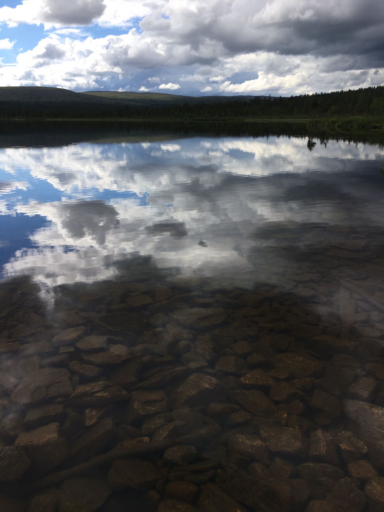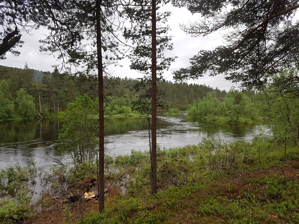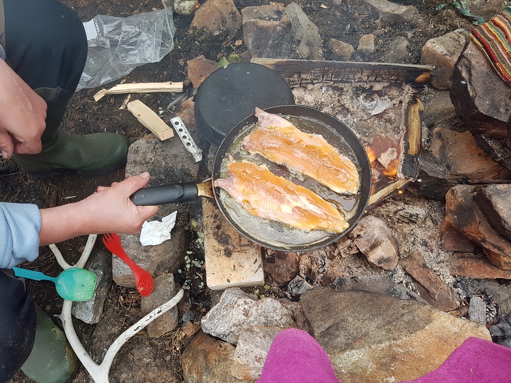 Aamu valkeni onneksi nyt sateettomana, vaikka taivaalla seilasi edelleen melkoisia pilviä. Kävin tekemässä tulet ja hain vettä puuron- ja kahvinkeittoa varten ja ihmettelin kun mummojen liikettä ei näkynyt. Sielläkin oltiin nukuttu sikeästi kahdeksaan asti, joten ulkoilma ja rasitus yhdistettynä mukavaan patjaan teki tehtävänsä. Iiris nousi ylös ja vaikutti entistä tukkoisemmalta jos vain mahdollista. Jätettiin valinta Iirikselle ja hetken aikaa kurkkuaan selviteltyään Iiris ilmoitti, että haluaa nähdä Lemmenjoen ja ylityksen venelossilla ja asia oli päätetty. Pitäydyttiin siis alkuperäisessä suunnitelmassa ja illan kohteeksi otettiin alemman venelossin telttapaikka Lemmenjoen varressa. Katja paistoi illalla saamani taimenen teflonpannulla ja pisteltiin se hyvällä ruokahalulla näkkileipien päällä. |