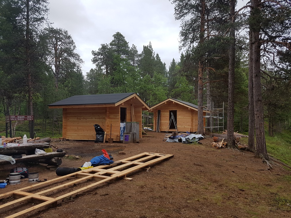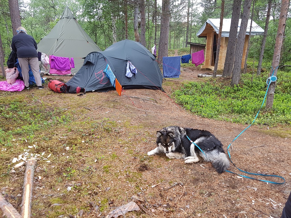Lounaaksi oli meetwurstilla höystettyä kasviskeittoa hapankorppujen kanssa. Yritettiin ottaa perinteiset nokkaunet, mutta vaikka pieni savunuotio oli vieressä, työntyivät itikat korviin ja joka paikkaan. Hetkisen sinnittelyn jälkeen vain Olavi taisi torkahtaa hetkeksi. Sitten oli edessä aika tiukka nousu vaaran päälle ja vasta melkein huipulla puhelimeen ilmestyi tarpeeksi palkkeja puhelua varten. Anja ja Irma soittivat yhtäaikaa Lassille ja Hannulle. Molemmilla taisi olla huolena onko miehet saaneet syödäkseen kotosalla, kuuluivat pärjänneen. Kuulumisten vaihdon jälkeen matkaa oli vielä nelisen kilometriä jäljellä ja kuten aina viimeiset kilometrit ovat ne pisimmät. Ennen Lemmejoelle saapumista on aika jyrkät harjanteet laskeuduttavaksi, mutta hyvin niistäkin tultiin ilman haavereita alas. saavuimme keskelle rakennustyömaata, eli joen rantaan on nousemassa uusi tulistelutupa vanha nuotiopaikan paikalle. Jouduimme jäämään siihen, koska toisen puolen telttapaikalla oli jo ainakin kaksi seuruetta valmistelemassa yöpymistä. |