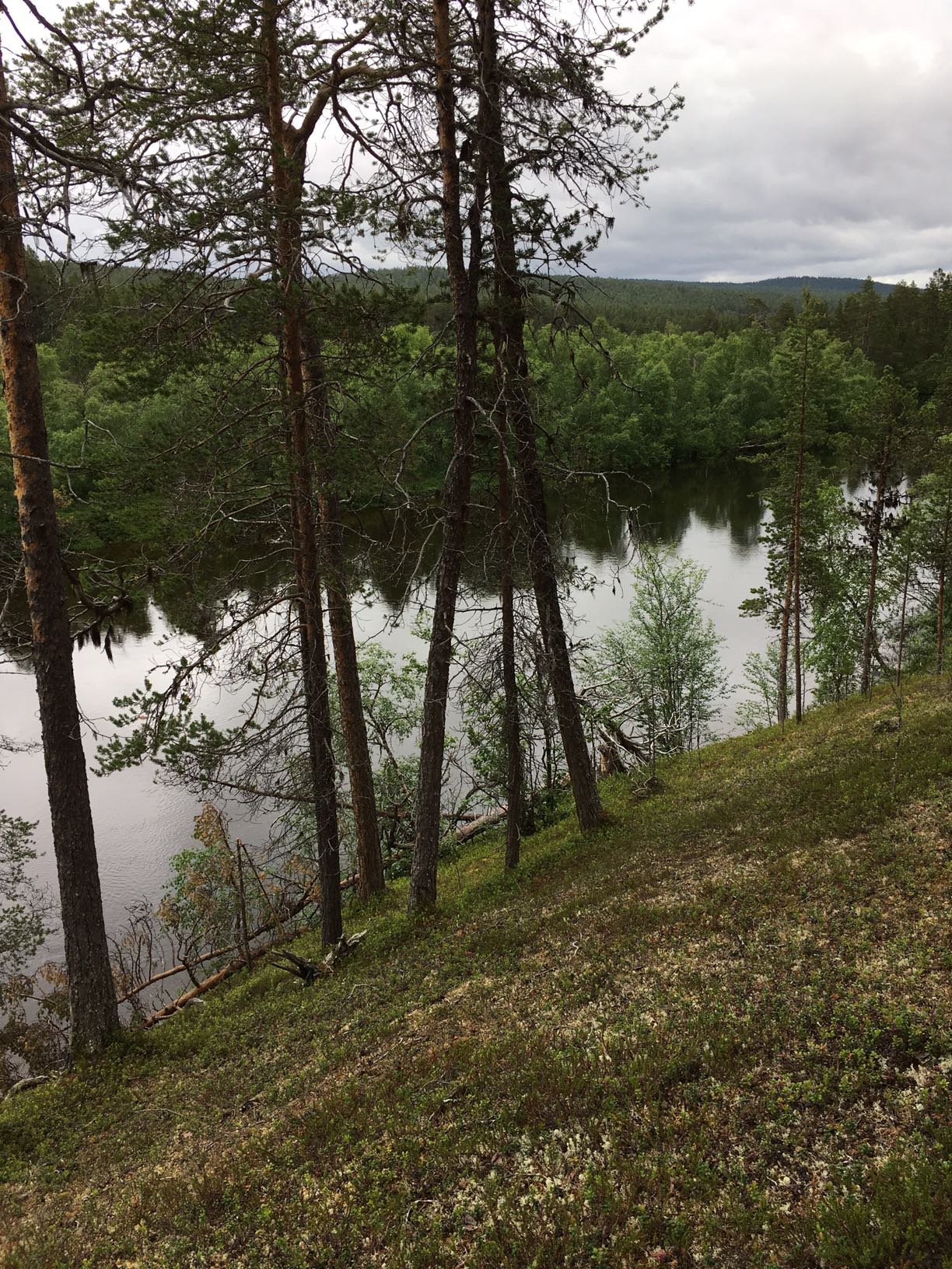 Joen toisella puolen korjailin hieman Ilmarin rinkan yläputkea, joka luiskahti nostohommissa paikoiltaan. Yritettiin katsoa mikä polku lähtee parhaiten viemään kohti Njurgulahtea, mutta ei etsitty riittävän korkealta, joten valittiin rantaa mukaileva polku, joka oli paikoin vaikeakulkuinen. Vasta reilun kilometrin jälkeen Ilmari löysi tiedustelulenkin jälkeen oranssein reittimerkein merkatun isomman uran, jolle kavuttiin pieni harjanne ylös. Pidettiin siinä repputaukoa jonkin aikaa ja lähtiessä vilkaisin viimeisenä kulkiessani, että kaikki on mukana. Tällä kertaa Ilmarin virveli oli kanervikossa ja nappasin sen mukaani. Ajattelin hetken aikaa kannella sitä ja kysyin sitten seuraavalla repputauolla Ilmarilta, että puuttuuko jotain. Ilmari tajusi, että virvelihän se jäi, mutta helpottunut ilme tuli kasvoille kun kaivoin selän takaa unohtuneen vavan. Ilmari oli jo valmistautunut ylimääräiseen lenkkiin hakuhommiin.