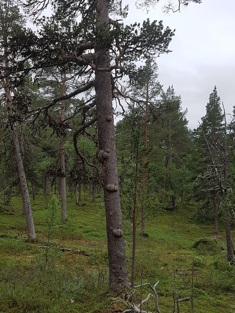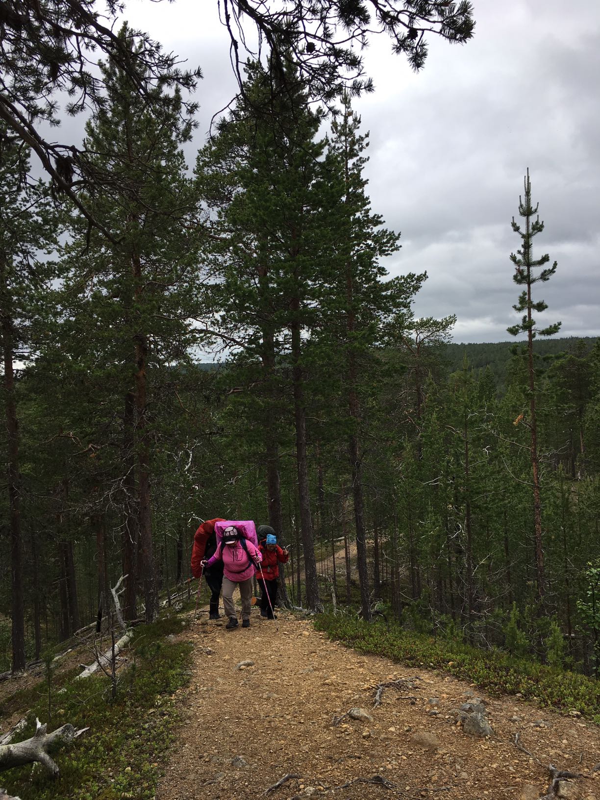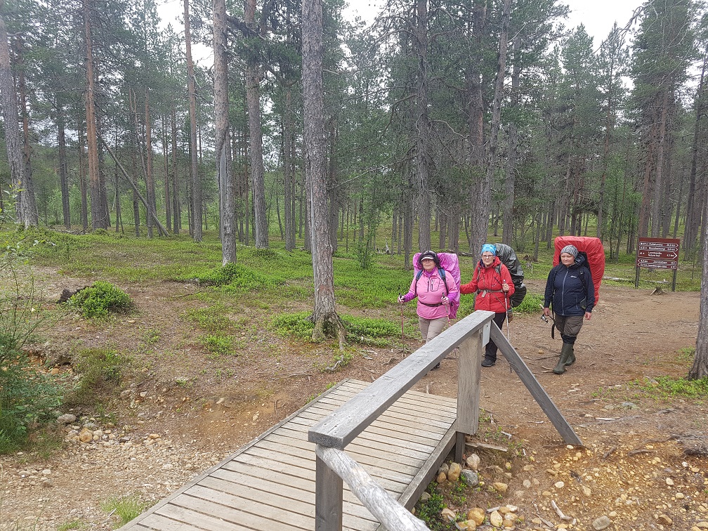 | Loppumatka Njurgulahden parkkipaikalle kulkee korkeaa harjumuodostelmaa pitkin lähes viiden kilometrin pätkän. Päiväretkeläisiä alkoi tulla vastaan ja toinen vaellusseurue ohitti meidät kun olimme tauolla. Olavi, Iiris, Ilmari ja Ruusa laittoivat ison vaihteen silmään ja katosivat näkyvistä. Katja odotteli meitä äänikirjaa kuunnelle pari kilometriä ennen maalia ja käveltiin yhdessä loppupätkä. Iiris soitti, että parkkipaikalta on vielä puolitoista kilometriä Ahkun tuvalle ja nuoriso jatkoi sinne autojen hakuun sillä välin kun me käpyteltiin hiljalleen parkkipaikalle. Viimeiset poseeraukset ja reilut viisikymmentä vaelluskilometriä olivat takana. Kaikki perillä hyvissä voimin ja ilman suurempia haavereita. Iiris jaksoi kipeänä urheasti ja Ilmarikin sinnitteli jalkansa kanssa. Ilmari ja Olavi ottivat isoa roolia kantamalla suuren osan painavista varusteista mukaanlukien mummojen alustat ja makuupussit omiensa lisäksi. Irma taisi kyllä viimeisen päivän kantaa jälleen omaansa, eli voimia oli varastossa ja Anjakin tuli sitkeästi omaa tasaista vauhtia turhia valittelematta. Välillä ylämäissä huokailtiin, mutta niin huokailin minäkin rinkkani alla, joten ihan sopiva oli sekä matkavauhti, että matkan pituus tälle porukalle. Pakkailtiin rinkat sellaisinaan autoihin ja ajeltiin Inarin Nesteelle munkkikahveille, jotka Anja tarjosi koko porukalle. Siitä jatkettiin Ivaloon, jossa ostettiin illalle sekä ruokaa, että juomaa riittävästi. Sitten hurautettiin Saariselän keskusvaraamolle, josta olimme jo matkalta soitelleet yöpaikaksi rivitalohuoneiston. huoneisto oli Kuukkelin ja Saariselän Panimon puolivälissä, eli keskeisellä paikalla meidän tarkoitusperiin nähden. Saman tien sauna lämpiämään ja Katja ja mummot alkoivat ruoanlaittoon. Herkullista pekonilla vuorattua barbequekanaa salaatin ja tuoreen leivän kanssa päästiin nauttimaan saunomisen päälle. Sitten nuorempi väki otettiin suunnaksi Panimo, jossa nautittiin pari huurteista ja peilailtiin Jazzia kuunnellen sekalainen setti karaokea. Käytiin vielä testaamassa vastapäisen grillin makkaraperunat ja todettiin ne aika onnettomiksi hintaan nähden. Sitten nukkumaan lakanoiden väliin.