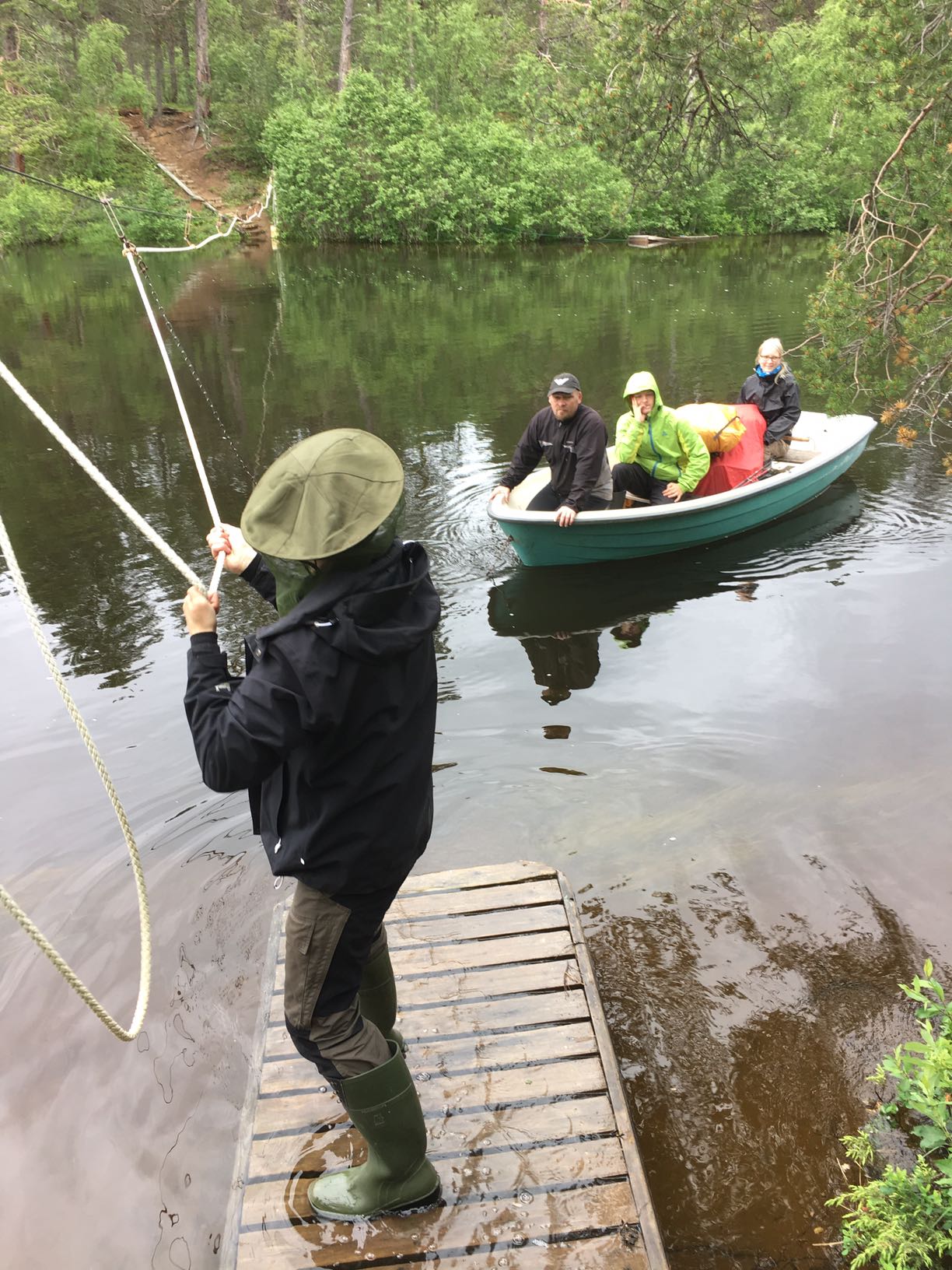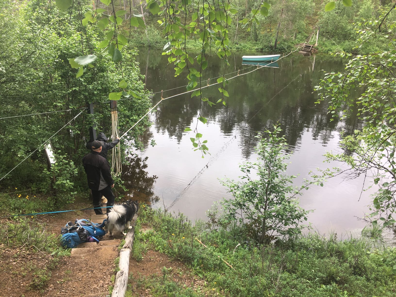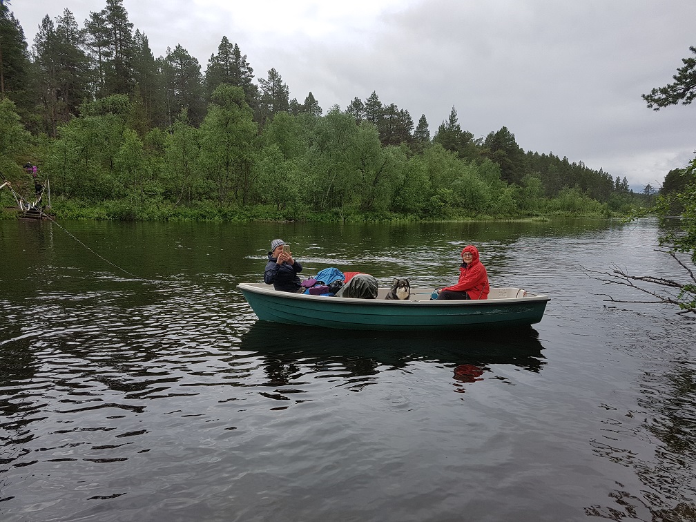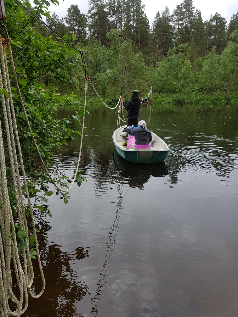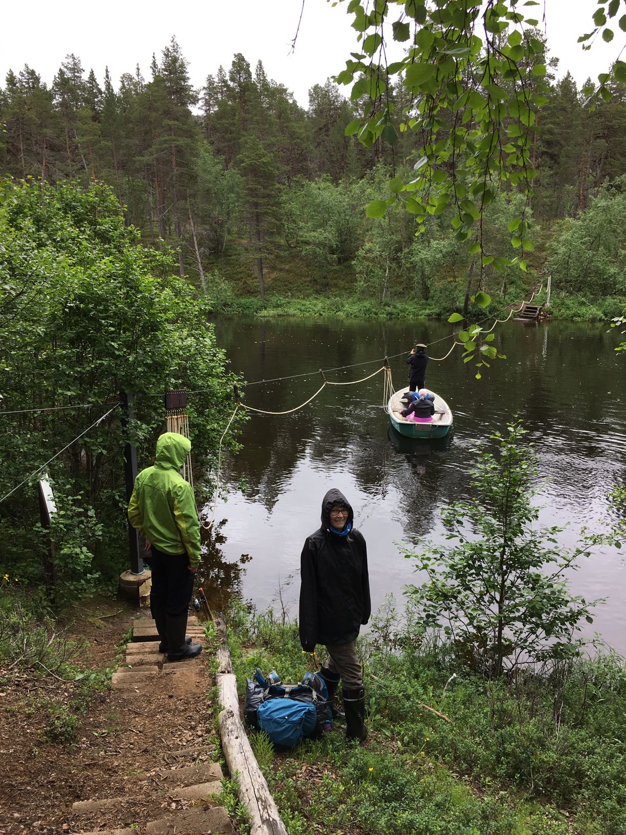 Nousin tulien tekoon kosteaan nuotionpohjaan, koska yöllä oli taas sadellut jonkin verran. Ehdittiin keitellä puuro- ja kahvivedet kun työmiesten pitkä jokivene rantautui täynnä rakennustarvikkeita. Toivottelin huomenet ja pahoittelin, että ollaan työmaan keskellä, mutta Metsähallituksen kaveri totesi asian olevan täysin ok ja paikka on edelleen myös vaeltajien käytössä, vaikka heillä siinä urakka onkin käynnissä. Lemmenjoen vesi oli kuulemma lähes metrin korkeammalla normaaliin ajankohtaan nähden ja se selitti myös erämaaosan purojen vetisyyttä. Tämä huomattiin kyllä myös venelossia vastarannalta vetäessä. Minulla meinasi loppua pituus vetohommiin, joten Olavi ja Ilmari ottivat vetojuhdan roolit. Saatiin vene rantaan ja ensimmäisenä ylityksen tekivät Ilmari ja Anja rinkkoineen. Näin saatiin Ilmari vetämään toiselle rannalle ja Olavin kanssa jäätiin vielä toiselle puolelle. Katja, Irma ja Ruusa menivät seuraavina ylitse ja viimeisenä tultiin Iiris, Olavi ja minä. Puolisen tuntia tuhraantui joen ylitykseen, mutta ihan mukava episodihan tuo oli, eikä siitä muutoin olisi yli päästykään tuolla virtaamalla. | |||||