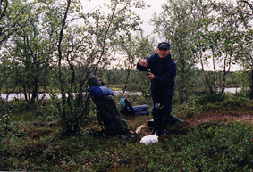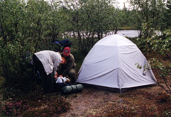 Vaelluksella mukana olivat: Ari Lukkarinen, Katja Kuittinen, Harri Lipponen ja Anu Kuittinen. Vaellusajaksi valittiin Heinä-Elokuun vaihde ja valinta osui nappiin. Kelit olivat juuri sopivat vaellukseen eikä vesisadekaan monesti haittanut viikon aikana. Itikoita ei näkynyt yhtään kappaletta eikä muitakaan pörriäisiä. Kalaa syötiin joka päivä eri muodoissaan.. Ajomatkaa kesti 12 tuntia ja perillä Muotkan Ruoktun pihalla oltiin yöllä kahden maissa. Ruoktun isäntä tuli vastaan ja antoi luvan pitää autoa pihassaan ja vitsailipa ettei teidän välttämättä tarvitse mennä tunturiin lainkaan, koska hänellä on jo kuvia sieltä. Tarjosi sen sijaan täysihoitoa mökissä viikoksi, noh, valitsimme kuitenkin vaelluksen =). Patikoimme yön hämärässä kilometrin verran Peltojoen rantaan. Heti perille päästyämme laitoimme teltat pystyyn ja veri veti heittelemään koskelle, saaliina yksi tammukka joka naposteltiin tulilla ennen nukkumaan menoa...Uni maistui ! |