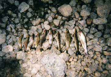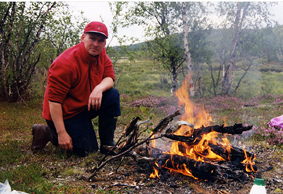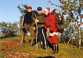 Puuron voimalla otettiin suunta kohti tuntureita kuljettuamme ensin pari kilometriä joen vartta. Matkalla tuli vastaan neljän hengen seurue tieltä päin matkalla suurinpiirtein meidän reittiä vastakkaiseen suuntaan. Olivat saaneet joesta yöllä 40 senttisen taimenen, neuvoimme auliisti harjuspaikan. Nousu tunturiin oli aika raskas, ja pieni suunnistuskämmi vei meidät hieman aiottua etäämmäs laesta. Tunturin rinteellä matka kuitenkin joutui nopeasti kohti lounaskurua. Harrilla oli matkassa savustuspussi, jonka täytimme harjuksilla. Alkupalaksi paistoin tikkukalana 4 harjusta. Söimme itsemme niin ähkyyn, ettei ole tosikaan, taas oli otettava unta palloon hetken aikaa. Jatkoimme matkaa kohti ylempää Honkavuomaa osuen "kellonkadottamaäytsiin", joka oli aikamoinen ylitettävä. Laskeuduimme kurun pohjalle mässäilemään viimeiset 4 harjusta, loput jouduimme jo uhraamaan seidalle =) Tavoitettuamme Honkavuoman alkoi varsinainen moottoritie, kangasta oli niin helppo kulkea ja toinen toistaan upeampia tulipaikkoja oli kuivan joen rannalla. Tulipuita oli vaikka millä mitalla ja valitsimmekin yöpaikan kohdasta, jossa oli tervaspuuta monta mottia. Paistelimme lettuja trangian pannulla, onneksi oli toisessa teflonpinta..Tulilla meni myöhään ja kalalle lähdettiin Harrin kanssa yli puolen yön. Katsoimme kartalta, että parin kilometrin päässä joki näyttää kapeammalta. Meinasi usko loppua, kun vettä oli parhaillaan nilkkoihin eikä kaloista hajuakaan. Kävelimme vielä pidemmälle ja tulihan sieltä koski vastaan, jossa joki kapeni ja sen päätteeksi oli pieni suvanto pajukkorantoineen. Ja siellähän ne kalatkin olivat, tammukoita saimme parikymmentä ja Harri tietysti kaimansa. Ne kalat olivat kyllä työn takana, päivämatkan päälle kävelimme toisen kalojen perässä, taisi kello olla yli kolmen aamulla kun tulimme takaisin. Eivät olleet tytöt enää kortin peluussa, johon sanoimme tulevamme ihan "kohta", kunhan on heitelty muutama heitto.. |