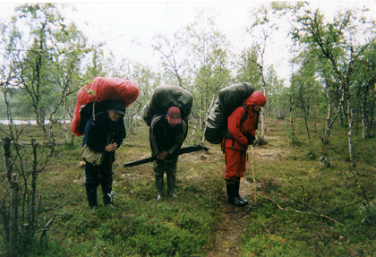 Aamulla uni maistui ja nukuimmekin yli kymmeneen. Katselimme kartalta, että seuraava yö oltaisiin vielä maastossa, kohdassa jossa Kiellajoki yhyttää Honkavuoman. Lähdimme taivaltamaan helppokulkuista maastoa ja nälän yllättäessä saavuimme sopivasti puron varteen. Perustimme hetkessä aikamoisen mustalaisleirin ja tammukat aseteltiin keppien nokkaan kohti tulia. Mässäilimme jälleen aivan liikaa, tammukkaa, harjusta ja pastaa. Seurauksena tietysti oli heittäydyttävä pitkälleen kankaalle. Paikalle sattui pariskunta, varmasti katselivat huvittuneena leiriämme, jossa tammukan ruotoja ja päitä oli ympäriinsä ja neljä ähkyään valittavaa pitkin kangasta. Niinpä kysyivätkin että olette varmaan tässä yötä, johon oli pakko nauraen todeta, että lounastauko on vain menossa =) Mies sanoi saaneensa lounastaulla kiloisen harjuksen joesta aivan laavun kohdalta jossa olivat. Matka jatkui ja ensimmäinen sadekuuro tuli vastaan, pidimme sadetta hetken rinkkojen suojassa kyykkien. Saavuttuamme jokien yhtymäkohtaan oli kello noin 4. Hetken mietittyämme tilannetta auttoi kerääntyvät mustat pilvet sen verran, että jatkoimme vaellusta tielle saakka. Viimeinen joen ylitys oli alempi Honkavuoma pari kilometriä ennen tietä. Anu ja Harri saivat liftikyydin Ruoktulle ja tulivat noutamaan meidät tien varresta. Olisimme jääneet lomakylään, johon saavuimme kävellen, mutta isännällä (ei siis ruoktu, vaan toinen) oli huono ilta, joten aloimme soittelun Inariin ja Ivaloon. Inarista löytyi vielä leirintäalueelta mökki, jonne piti ehtiä ennen puoltayötä. Matkalle sattui kuitenkin Hotelli Inari, jossa oli grilli auki..sinne siis ja hampurilaisateriat vielä mukaan. Leirintäalueella oli jo isäntä porttia sulkemassa, mutta ehdimme sentään. Ja oluetkin saatiin pienen neuvottelun jälkeen. Mökissä tyhjenneltiin loput retkijuomat ja unta ei tarvinnut houkutella. |