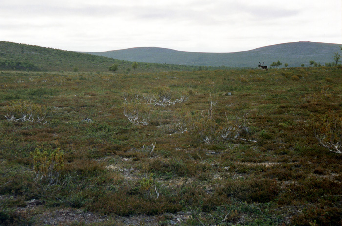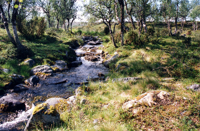 Aamulla harmitti tammukat, jotka olivat jääneet yöpymään puunoksalle. Jäi herkut syömättä, koska puuro & kiisseli kahvin kera täytti mahan sen verran tehokkaasti. Katja kävi uimassa minun tyytyessä räpeltämään purossa, oli kylmää..Olimme ihmetelleet porojen katoamista, mutta noustuamme kaunista puronotkoa Stuorraskaidin rinteelle, alkoi porojakin tulla vastaan. | |||||||||||