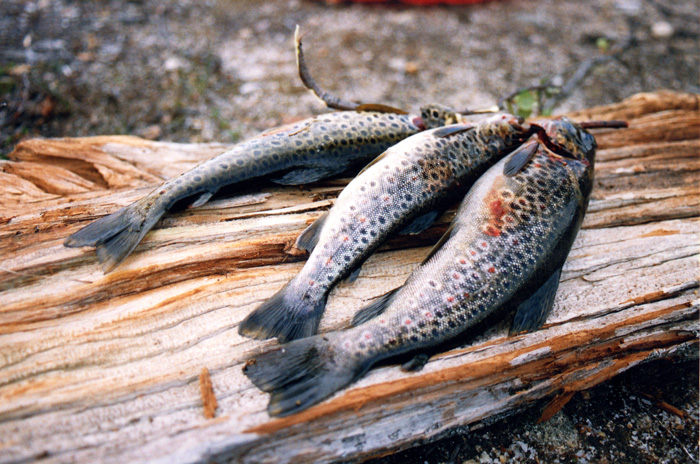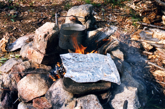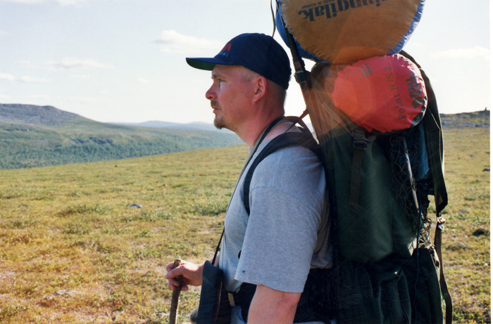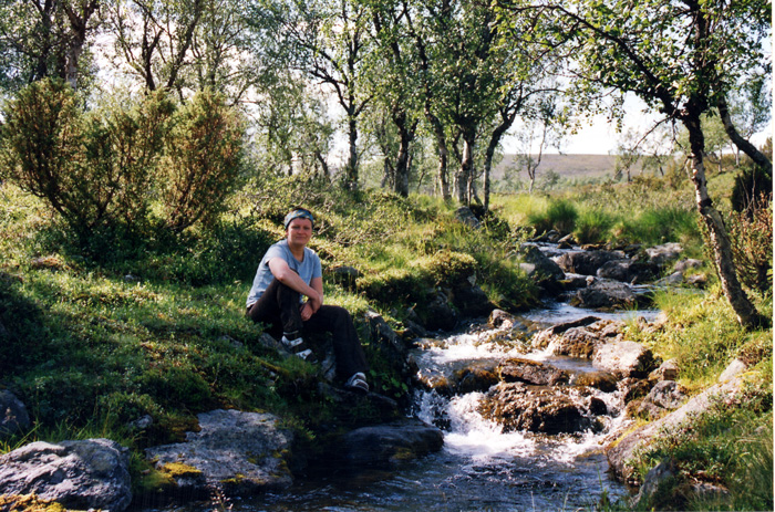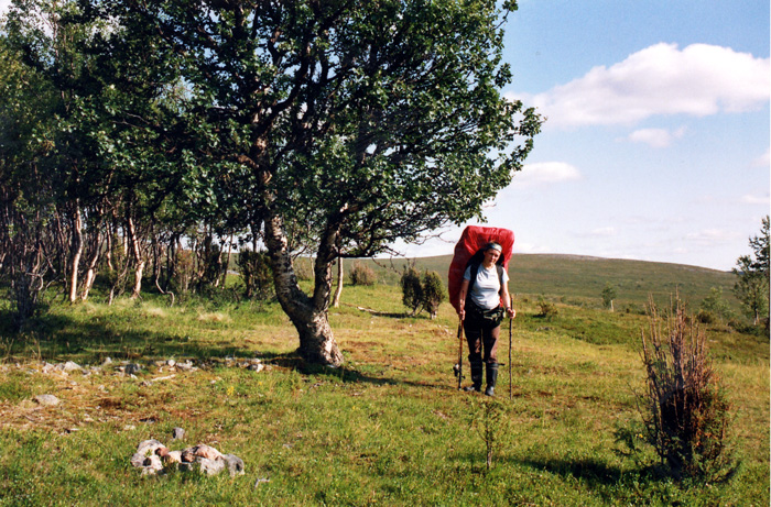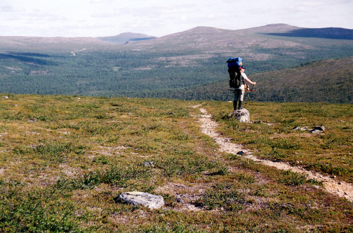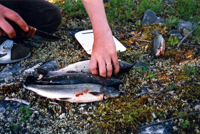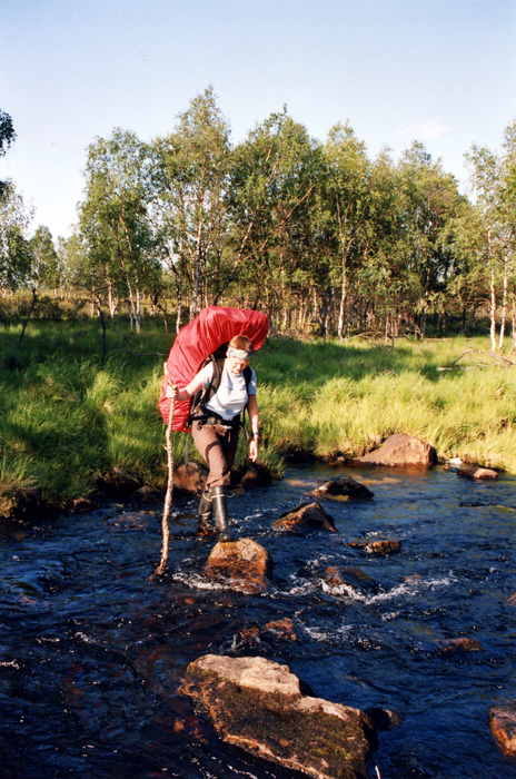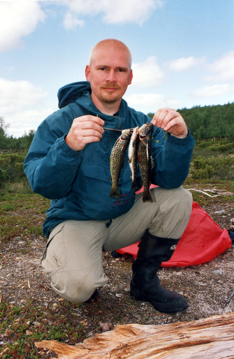 Seurasimme poroaitaa jonkin matkaa, kunnes polku johdatti aitauksen sisään ja kohti Rådnajohkaa. Joelle saavuttuamme heitimme rinkat selästä ja katsastin joenmutkan kohdalla olevan lampareen. Vesi oli aika vähissa, mutta montussa sitä oli toista metriä. Arvelin kokeilla ovatko tammukat ottipäällä täysin helteisellä auringonpaisteella. Sää oli tosiaankin muuttunut aamun usvasta helteeksi parissa tunnissa. Sain seitsemällä heitolla kolme tammukkaa. Kauniita kaloja olivat nämäkin ja perkauksen jälkeen kevyesti suolaa pintaan ja savustuspussiin odottamaan lounastaukoa. Nappasin nuotiopaikalta rinkan taakse pari kuivaa kelokäkkärää varmistaakseni tulen savustusta varten. Teko kostautui osuttuamme väärälle puolelle poroaitaa tunturiin noustessamme. Katja sujahti aidan alitse, mutta minä jäin käkkäröistä kiinni naama turpeeseen painettuna. Oli aika tukala olotila 25 kg rinkan kanssa ryömiä sentti kerrallaan varvikossa, mutta lopulta yritys palkittiin ja matka jatkui. Kun pääsimme Stuorraoaivin rinteeseen, alkoi aurinko tehdä todella olon tukalaksi. Vaellus jatkui paitahihasillaan ja hiki valui jatkuvasti, pulssi paukutti > 140 ja hengitys alkoi käydä puuskuttavaksi. Saavutimme rinteessä entisen poroaitauksen, josta merkkinä oli enää tiheä koivikko, joka osoitti tarkasti minkä muotoinen erottelupaikka oli ollut. Katja väitti metsurin olevan alempana töissä...Hetken mietin, että mitähän metsuri täällä tekisi, ja äänen lähteeksi paljastui poron vasa, jonka ääni kieltämättä muistutti moottorisahaa :) Rinteeltä pilkotti vielä radiomasto tunturinlakien takaa ja saatiin soiteltua muutama tervehdyspuhelu ennen laskeutumista alemmille maille. Reissun ehdottomasti upein taukopaikka löytyi Tseävrajohkan varrelta, johon laskeutui ylempää villisti virtaava sivupuro. Paikalla oli vehmasta runsaasta kosteikosta johtuen ja aurinko paistoi puiden oksien läpi lämpimästi. Tulipaikka oli hieno, mutta onneksi olin raahannut paria kunnon tulipuuta mukanani, koska muut tulipuut olivat kosteita tai märkiä. Tehtiin isot tulet ja etsin laakakiven savustuspussin alle. Keiteltiin samoilla tulilla pakissa kahvit ja alkuruuaksi pisteltiin keittoa. Tammukat olivat juuri sopivan kypsiä ja savustuneita, namia. Matka jatkui kohti Urroaivia, joka kierrettiin kulkusuunnassa oikealta. Urroaivin rinteeltä avautui laaja näkymä kohti Piekanaäytsiä, josta saavuimme kohti Kiellajokea kesällä 2002. Muistaakseni näillä main jalka alkoi esittää ensimmäisiä vastalauseita kävelylle. Pohkeessa tuntui paine jokaisella askeleella ja automaattisesti aloin hieman ontumaan oikeaa jalkaa. Tämä taas näin jälkikäteen ajatellen aiheutti reissun jälkeisen selkäkivun, joka jatkui pitkään. Luultavasti siis ontuessa rinkan kuorma pääsi heilahtamaan ja samalla vääntämään selkärankaa sivulle, josta nikamavälit eivät tykkää. Noh, takaisin vaellukseen, jatkoimme siis kohti Kiellajoen latvoja. Yli olisi kannattanut mennä heti ensimmäisestä paikasta, mutta koska näin emme tehneet, jouduimme palaamaan suvannolta pari sataa metriä tiheää pusikkoa takaisin päin. Ylityspaikka oli suht kovaa virtaavaa nivaa, jossa oli kiviä siellä täällä. Muutaman pidemmän askelluksen joutui ottamaan ennekuin toinen ranta oli saavutettu. Saavuimme samalla paikalle, jossa olimme 2002 yöpyneet ja harjuksia vedelleet kosken alta. Uskalsin luvata Katjalle, että ensimmäisellä heitolla on kala kiinni ja niinhän siinä kävikin. Minä nostin kaksi harjusta ja pakotin myös Katjan kokeilemaan virvelin heittoa. Tuloksena myös kaksi harjusta, siihen piti lopettaa kalastaminen, enempää ei olisi jaksettu syödä. Pystyttelimme leirin ja naatiskelimme jo tavaksi muodostuneet sporttijuomat. Kuksallinen vodkaa ja hartsporttia auttaa kummasti palautumaan, jaksaa pystyttää teltan enempiä mutisematta. Tulipuut ovat tältä harjanteelta vähissa. Keräilin kaikilta läheisiltä nuotiopaikoilta polttamattomat pökkelöt, sekä raahasin yhden maapuun savustamista varten. Savustimme kaikki harjukset ja herkuttelimme niistä illalla kaksi. Mieli olisi tehnyt kalastamaan illalla, mutta järki sanoi muuta...periaatteella kaikki syödään mitä ylös nostetaan. Masu täynnä nukkumaan puolen yön maissa. |
