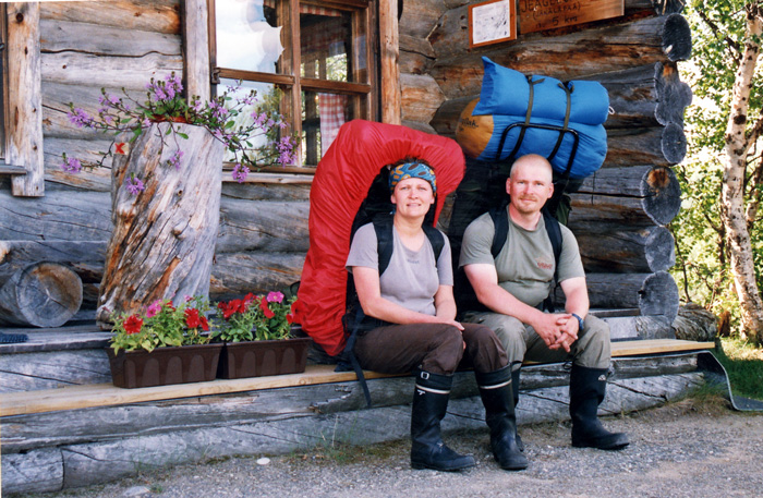 Viimeisen vaelluspäivän aamu kirkastui aivan yhtä aurinkoisena kuin eilinenkin. Lammen rannassa olevan putaman pohjasta pulppusi lähde tuoden jääkylmää ja kirkasta vettä aivan leiripaikan vierellä, ei ihme että tässä oli oleskeltu pidempäänkin. Katseltiin kertalta, että matkalla saavuttaisimme Hansin merkitsemän päiväretkipolun. Hans oli maininnut ennen lähtöämme, että jos kuljette siitä niin kurkatkaa laavuun. Löysimmekin Jeägeloaivin rinteeltä "laavun", jota itse kutsuisin kyllä kodaksi. Hans kyllä sanoi, että se on laavu, kota on hieman erilainen ja meidän laavut ovat kuulemma "hökötyksiä"..Lounaspaikka löytyi reitin varrella olevalta lammelta, joka vaikutti erittäin syvältä. Heittelinkin puolisen tuntia keskellä päivää ja olin varma, että kohta tärppää isompikin kala. Ei tullut edes nykäystä, mutta perillä sain kuulla, että sieltä olisi voinut tulla vaikka ennätystaimen. Joku rippikoulupoika oli juuri nostanut sieltä 2.7 kiloisen taimenen. Nätti paikka. Viimeiset viisi kilometriä sujuivat mukavasti ja edellisen reissun ensimmäinen yöpaikka bongattiin Peltojoen varrelta. Maantielle päästyämme ohitti meidät pyörillä kaksi Puolalaista nuorta miestä, jotka olivat käyneet kääntymässä NordKapissa ja olivat nyt paluumatkan alkupuolella. Kyselivät mistä olimme tulossa, kerroin hieman suurennellen, että vuorilta :). Poseerasimme vielä kameralle jo Ruoktun portailla istuassamme, jonka jälkeen painavan taakan sai taas heittää luultavasti noin vuoden ajaksi selästään. Saunoimme rantasaunassa aika varoen, koska käsivarret ja niska eivät ylimääräisestä lämmöstä oikein tykänneet. Mutta suihkussa oli oikein mukavaa jouksevan veden lutrautua. Saunan päälle poronkäristys ja olutta. Sen jälkeen hieman lisää olutta ja reissun kertausta terassilla. Hans opetti tuoretta koiranpentuaan seisomaan västäräkin avustuksella, kuulemma osasi jo hienosti. Yövyimme kahden hengen huoneessa, joka kelpasi ihan mainiosti siihen tarkoitukseen. |