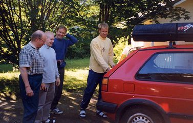 Matka kohti Kilpisjärveä aloitettiin kuusitieltä Nurmeksesta aamulla aikaisin. Jouko oli hakenut jo Markun matkalta kyytiin ja tavaratila näytti uhkaavan täydeltä. Golffiin asennettiin katolle suksiboxi ja sinne saatiin mahtumaan yllättävän paljon kamoja. Tavaratilakin täyttyi kattoa myöten mutta luukku meni kuitenkin onnellisesti kiinni. |