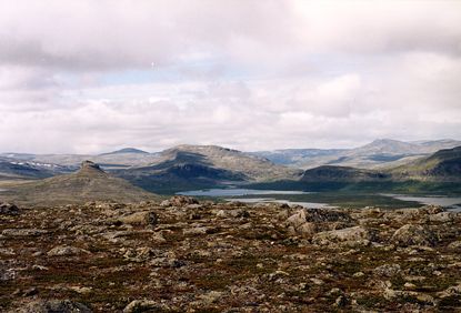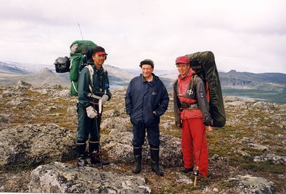 Jo ennen reissuun lähtöä olimme valinneet yhdeksi "pakko käydä" kohteeksi Harrijärven. Mökiltä suorin tie harrijärville vei Porovaaran kautta, joten aamun pienessä pääkivussa nousu vaaran laelle tuotti hikeä ja tuskaa. Markun polvi oli kipeytynyt samoin kuin minunkin, ja vuorotellen vaihdettiin sidettä jalasta toiseen. Komiat oli näkymät vaaran laelta, taitaa Haltikin hyvällä kelillä erottua, Saivaara näkyi selvästi vieressä. Laskeutuminen kohti Harrijärveä oli yhtä kivivirrassa pomppimista, eikä kipeytynyt polvi helpottanut tehtävää. |