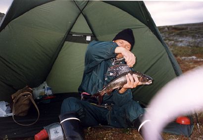 Illan hämärtyessä keräilimme irtorisuja nuotioksi, ja saimmekin aikaiseksi hyvät tulet. Paistoimme suurimman harjuksen savustuspussissa laakakiven päällä. Ilta oli niin hyytävän kylmä, että kaikki vaatteet piti kasata päälle ja silti tuntui että tuuli kohmettaa jäsenet. Onneksi tuli otettua kunnon makuupussi matkaan, Ajungilak tyin toimi hyvin, isää taisi hieman palella.. |