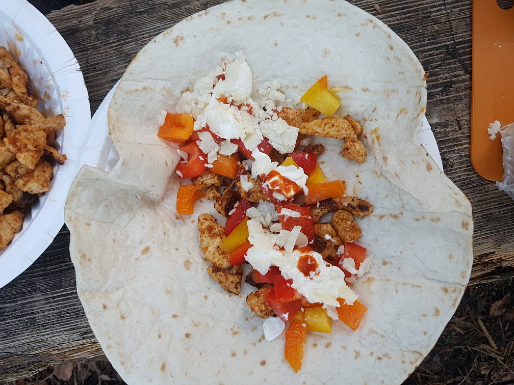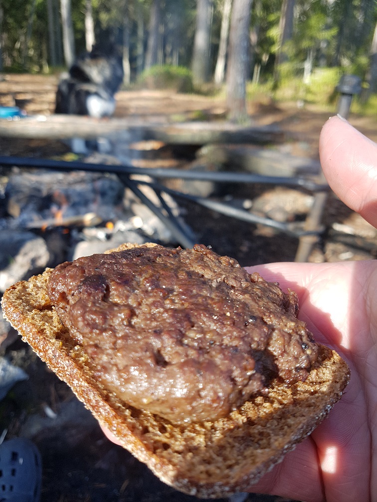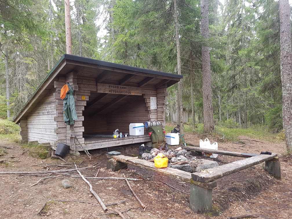 | Yöksi meillä oli tavoitteena Liesijärven laavu tai telttapaikka, mutta lounaalla ollut kaksikko oli aikeissa mennä sinne myös ja Liesijärveä lähestyttäessä sieltä kuului jo usean seurueen ääniä, jolloin turvauduttiin varasuunnitelmaan. Matka liesijärvelle oli todella märkää paikka paikoin ja onnistuin kastelemaan matalat vaelluskenkäni käytännössä läpimäräksi. Katsottiin kartalta, että pienen ajomatkan päässä olisi Rysäslammin laavu, joten suunnattiin liesijärven lähelle jätetyllä autolla sinne. Laavu on melkein metsäautotien varressa ja oli tyhjillään. Polttopuuhuoltoa laavulla ei ole ja puut olivat vähissä. Saatiin kuitenkin jämistä pilkottua nuotio kasaan ja kostuneet sukat ja kengät kuivumaan. Viereiseltä vuokramökiltä alkoi kuulumaan uskomaton älämölö ja hetken mietittiin vielä paikan vaihtoa. Onneksi mökin porukka taisi joko nukahtaa tai siirtyä sisätiloihin ja päätimme jäädä siihen yöksi. Välipalana nautittiin Pielisen savumuikkuja, poronpaistisiivuja ja parmesaania. Illalliseksi tehtiin Fajitaksia, joihin oli esivalmistettu kanasuikaleet mausteseoksessa.Pilkottiin paprikaa ja sipulia, sekä parmesaania ja olihan mukana toki purkillinen smetanaa, sekä chilitahnaa. Lettu lämpimäksi teflonpannulla nuotiolla ja täytteet sisään. Hyviä olivat. Onnistuin mystisesti polttamaan sukkani ruokailun yhteydessä ja niistä ei jäänyt kuin pieni tuhkaläjä pölkyn päälle. Onneksi oli varavaatekerta matkassa. Tyhjenneltiin pieni Jallupullo ennen nukkumaanmenoa ja taisi siinä minttukaakaotkin mennä yksin tein. Olimme jo nukahtaneet kun laavulle saapui hämärissä kajakilla koskia laskemassa ollut nuorimies. Aamuyöstä teeret kukersivat niin kovaan ääneen läheisellä suolla, että kuullosti ihan kuin ne olisivat olleet aivan laavun nurkalla.