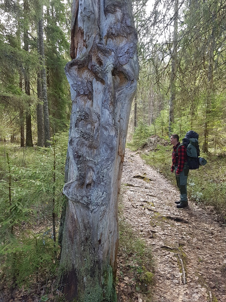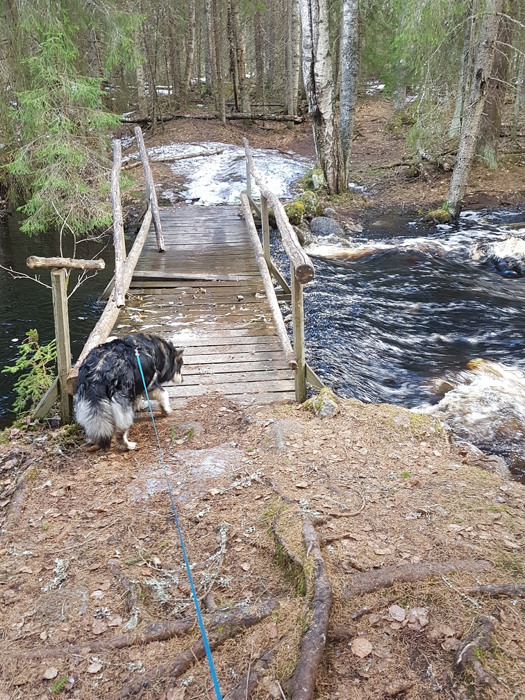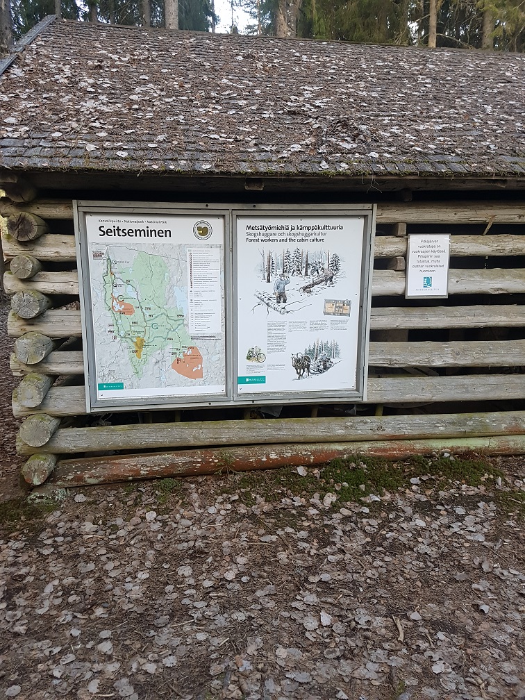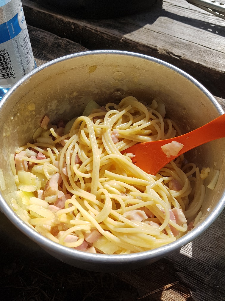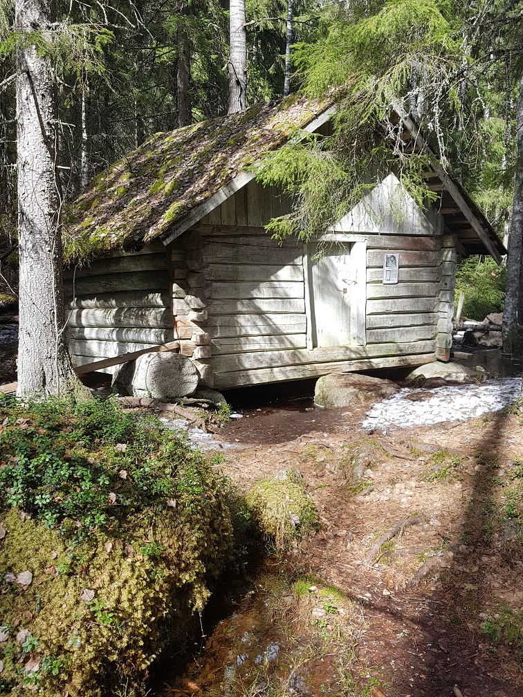 Aamu valkeni kirkkaana ja yöllä oli lämpötila käynyt nollan tuntumassa. Meillä oli molemmilla Expedin untuva-alustat ja Marmotin talviuntuvapussit, joten ainakaan kylmä ei päässyt häiritsemään. Ruusalla oli oma fleece, jonka päällä nukkui ja hyvin tarkeni. Aamiaiseksi laitettiin perjantain lounaalta jääneet hampurilaispihvit nuotiolla lämmitettyjen ruisleipien päälle. Puurot ja kiisselit kyytipojaksi kera nuotiokahvin. Suunnattiin rinkkojen pakkaamisen jälkeen kohti Koveroa vievää polkua ja heti polun alkuvaiheessa vastaan tulee todella järeitä keloja ja kilpikaarnamäntyjä. Polku erkanee oikealle ja ylittää Seitsemisjoen siltaa pitkin. Seuraavaksi vastaan tulee Haukilammen tulipaikka, jossa oli majoittuneena viiden hengen seurue modernissa sissiteltassa. Haukilammen jälkeen reitti yhtyy Koveron perinnetilalle vievään uraan. Olimme suunnitelleet täyttävämme juomapullot Koveron kaivolta, mutta vesi on ilmoituksen perusteella juomakelvotonta keittämättä, joten piti pärjätä mukana olleella vesimäärällä. Kuvailtiin hetken aikaa hienoa pihapiiriä ja jatkettiin sitten Multiharjun aarnialueen kiertävälle polulle. Komeaa vanhaa metsää ja upeasti kelottuneita ikihonkia. Marssimme Jokiristin tulipaikalle lounaan tekoon ja lounaaksi keiteltiin iso kattilallinen pastaa. Paistinpannulla ruskistelin ison pilkotun sipulin ja runsaasti valkosipulia. Pekonia ja iso kimpale savustettua kinkkua silputtuna voissa paistettuna. Ainekset kahteen kattilaan ja sekaan pari raakaa kananmunaa per kattila, sekä pippurimaustettua ruokakermaa purkillinen. Päälle kunnon kasa parmesaanisiivuja ja ääntä kohden. Vieressä ruokailuamme seuranneilla sisaruksilla oli hernekeittoa ja kasvissosekeittoa ja hieman taisi näkyä ruokakateus silmäkulmassa. Muutaman yön reissulle jaksaa kantaa myös sulan maan aikaan hieman luksusta. Illoille oli varattu punaviiniä ja valkoviiniä, joka alkaa olla hieman siinä rajoilla. Jatkettaessa kohti Liesijärveä tulee matkalla vastaan hieno entisöity vesikäyttöinen mylly, jota pääsee katsomaan sisältäkin päin.