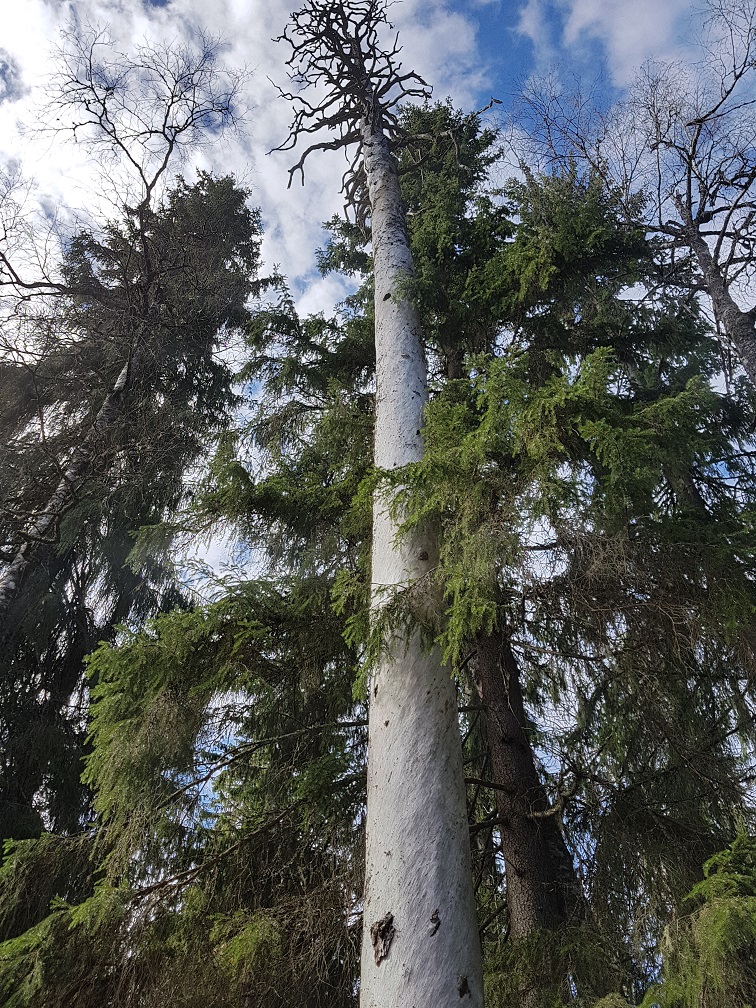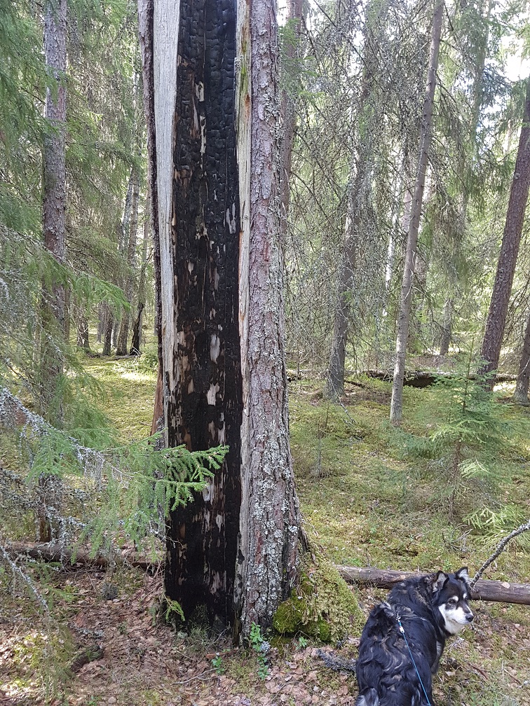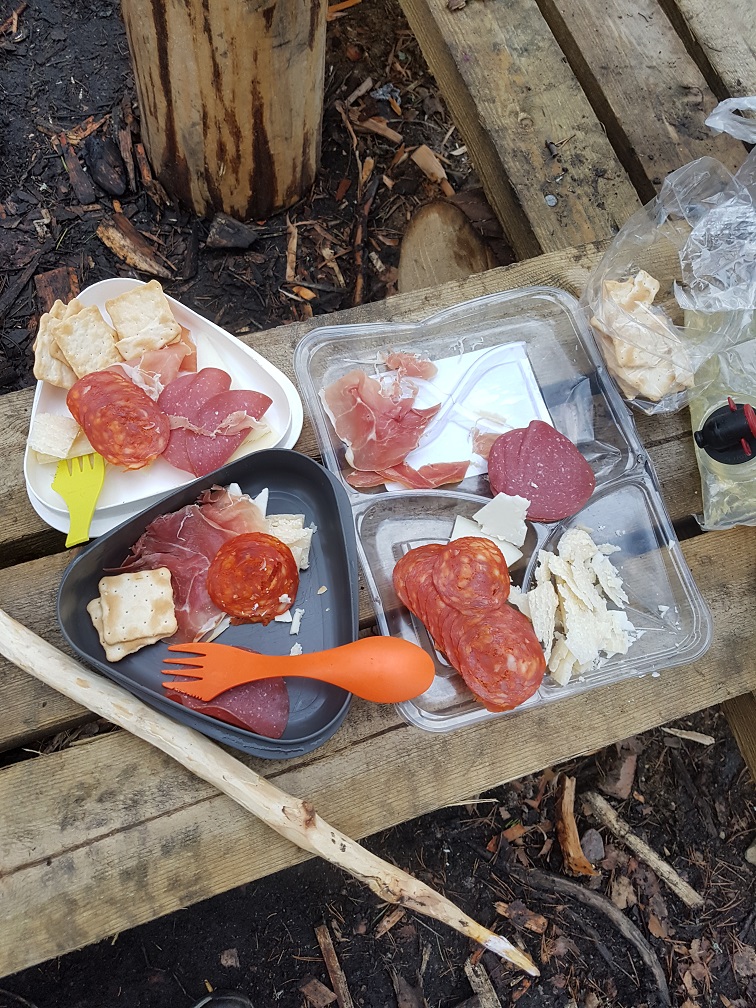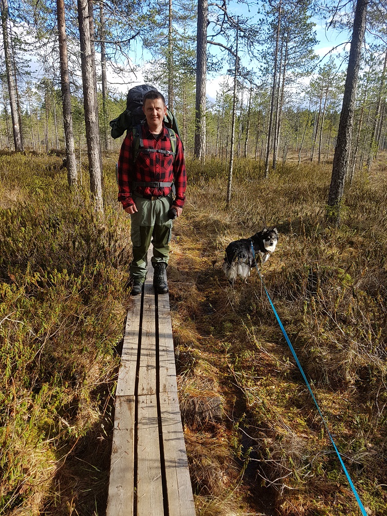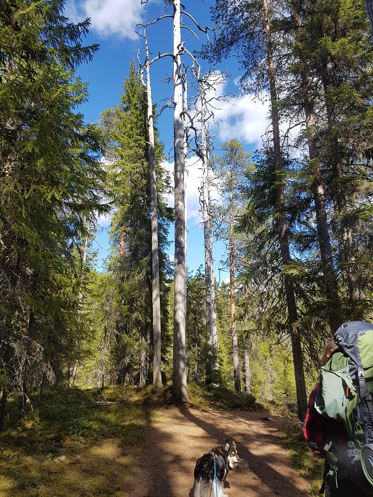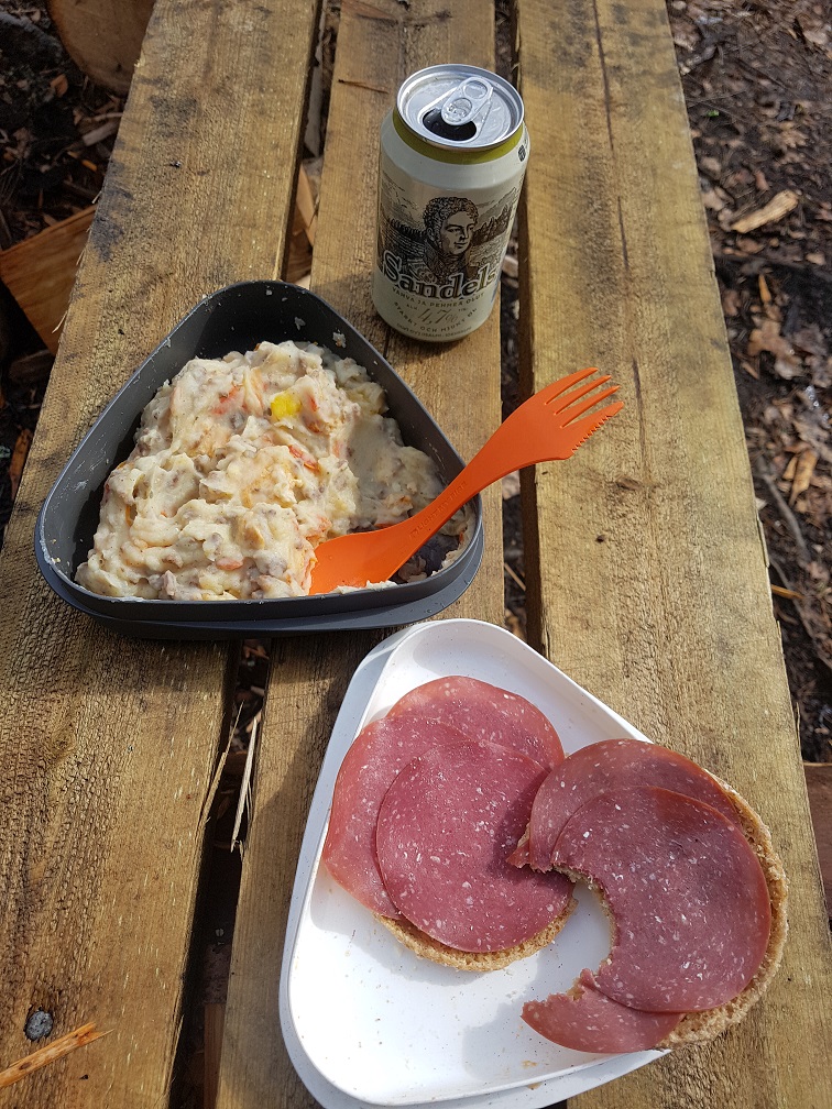 Aamu valkeni kirkkaana ja yöllä oli lämpötila käynyt nollan tuntumassa. Meillä oli molemmilla Expedin untuva-alustat ja Marmotin talviuntuvapussit, joten ainakaan kylmä ei päässyt häiritsemään. Ruusalla oli oma fleece, jonka päällä nukkui ja hyvin tarkeni. Aamiaiseksi laitettiin perjantain lounaalta jääneet hampurilaispihvit nuotiolla lämmitettyjen ruisleipien päälle. Puurot ja kiisselit kyytipojaksi kera nuotiokahvin. Suunnattiin rinkkojen pakkaamisen jälkeen kohti Koveroa vievää polkua ja heti polun alkuvaiheessa vastaan tulee todella järeitä keloja ja kilpikaarnamäntyjä. Polku erkanee oikealle ja ylittää Seitsemisjoen siltaa pitkin. Seuraavaksi vastaan tulee Haukilammen tulipaikka, jossa oli majoittuneena viiden hengen seurue modernissa sissiteltassa. Haukilammen jälkeen reitti yhtyy Koveron perinnetilalle vievään uraan. Olimme suunnitelleet täyttävämme juomapullot Koveron kaivolta, mutta vesi on ilmoituksen perusteella juomakelvotonta keittämättä, joten piti pärjätä mukana olleella vesimäärällä. Kuvailtiin hetken aikaa hienoa pihapiiriä ja jatkettiin sitten Multiharjun aarnialueen kiertävälle polulle. Komeaa vanhaa metsää ja upeasti kelottuneita ikihonkia. Marssimme Jokiristin tulipaikalle lounaan tekoon ja lounaaksi keiteltiin iso kattilallinen pastaa. Paistinpannulla ruskistelin ison pilkotun sipulin ja runsaasti valkosipulia. Pekonia ja iso kimpale savustettua kinkkua silputtuna voissa paistettuna. Ainekset kahteen kattilaan ja sekaan pari raakaa kananmunaa per kattila, sekä pippurimaustettua ruokakermaa purkillinen. Päälle kunnon kasa parmesaanisiivuja ja ääntä kohden. Vieressä ruokailuamme seuranneilla sisaruksilla oli hernekeittoa ja kasvissosekeittoa ja hieman taisi näkyä ruokakateus silmäkulmassa. Muutaman yön reissulle jaksaa kantaa myös sulan maan aikaan hieman luksusta. Illoille oli varattu punaviiniä ja valkoviiniä, joka alkaa olla hieman siinä rajoilla. Jatkettaessa kohti Liesijärveä tulee matkalla vastaan hieno entisöity vesikäyttöinen mylly, jota pääsee katsomaan sisältäkin päin.