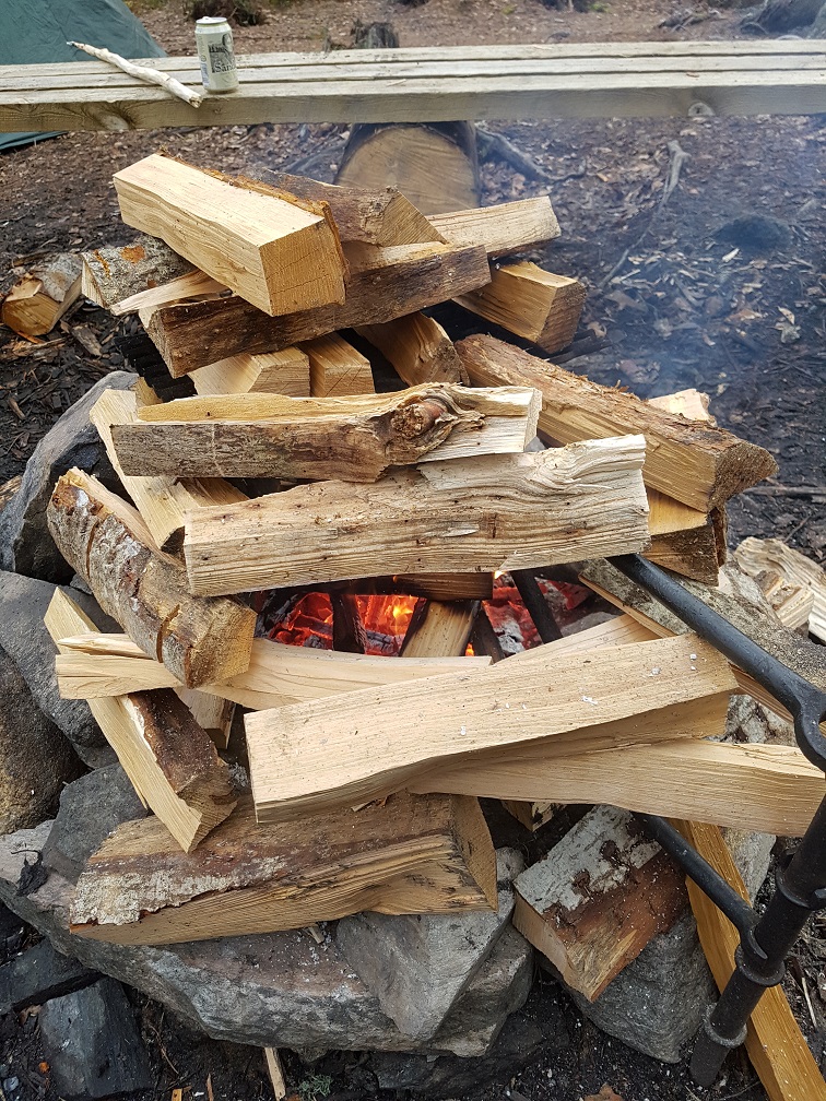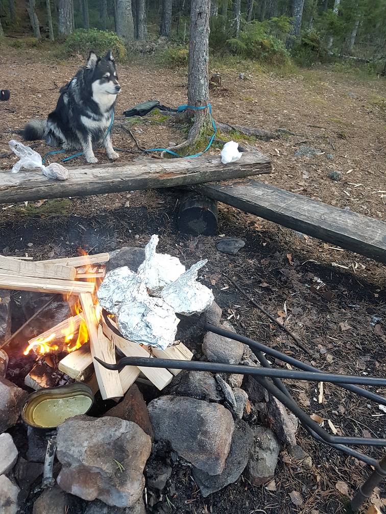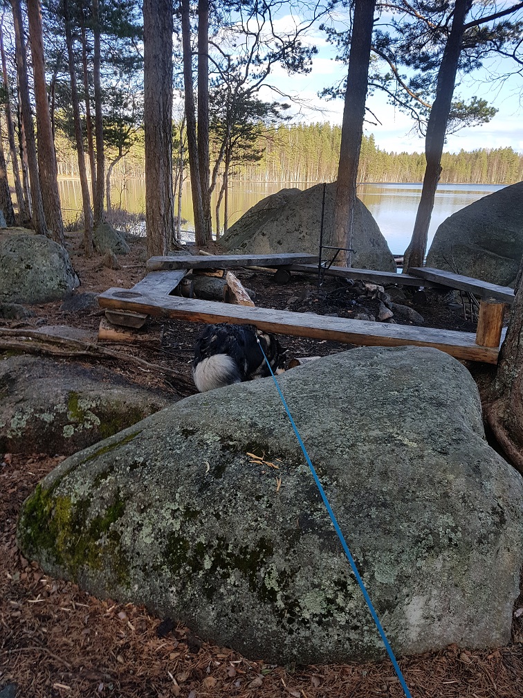 Ilta hämärtyi ja päätimme jäädä yöksi tulipaikalle, vaikkei se virallinen telttapaikka olekkaan. Laitoimme Penalaavun pystyyn aivan nuotion välittömään läheisyyteen siten, ettei siitä jälkiä jäänyt yöpymisestämme. Istuttiin tulilla puolille öin ja nautiskeltiin hieman nestemäisiä kantamuksia vähemmäksi. Ruusa tarkkaili valppaana ympäristön tapahtumia ja varsinkin varausmökin nuotiopaikalta kantautuvia ääniä. | |||||||||||||||||||||||||||||