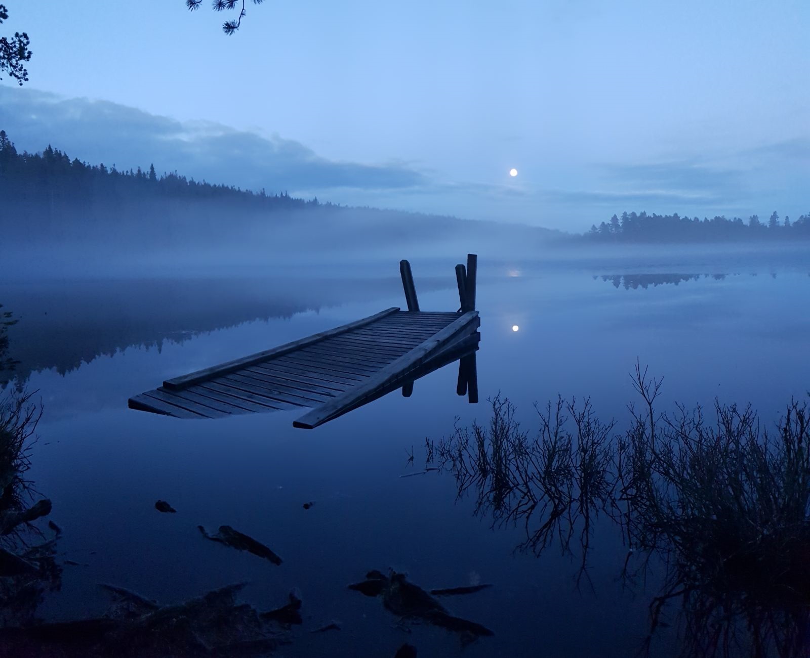 | Aamulla kajakkimies lähti jatkamaan laskujaan ja me pakkailtiin tavaramme autoon ja lähdettiin hakemaan toista autoa luontokeskukselta. Nautiskeltiin munkkikahvit ja kurkattiin näyttely ennen siirtymää Helvetinjärven puiston puolelle. Koko ajomatkan sateli vettä hiljakseen, mutta kun saatiin auto parkkiin Haukkajärven parkkiin, niin sadekin sopivasti hiljeni. Kilometri Haukkajärveltä Helvetinkolun suuntaan oli reitti poikki joen tulvittua sillan yli. Heitettiin kengät jalasta, käärittiin lahkeet ylös ja jääkylmään veteen kahlaamaan. Mukavasti alkoi veri kiertämään jaloissa kun päästiin toiselle puolelle. Otettiin vähän näkkäriä ja kinkkua näköalapaikalle rakennetulla ruokailuryhmällä ja samalla kuultiin kuinka yhtä aikaa parkkipaikalle saapuneet Espanjalaiset saapuivat joelle. He kääntyivät pitkän äänekkään pähkäilyn jälkeen takaisin. Jatkoimme lounaan tekoon Iso-Ruokejärven tulipaikalle ja sieltä oli juuri lähdössä myöskin sissiteltan kanssa liikkeellä ollut seurue. Tulipaikan kaikki polttopuut olivat märkää leppää. Puut piti pilkkoa todella pieneksi tikuksi, jotta sai edes jonkinlaisen tulen aikaiseksi. Kasattiin nuotion viereen puita kuivumaan iltaa varten, mutta nuotio meinasi hyytyä heti kun sitä ei ruokkinut ohuella tikulla. Jani laittoi lounaaksi kuivatusta jauhelihasta ja perunamuussista sekoituksen ja oikein maukkaan sellaisen. Päivän ja illan mittaan jonkin verran porukkaa kävi makkaran paistossa. Sadekuurot ja formuloiden seuraaminen viivästytti meidän jatkamista sen verran, että päätettiin jäädä yöksi ilman kiireen tuntua. Penalaavu pystyyn ja nuotiolle istumaan. Illalliseksi oli Janin esivalmistama herkullinen paella ja alkupaloiksi Tapaslajitelma. Juomana valkoviiniä ja muutama olutkin taisi vielä repun kätköistä löytyä. Onneksi "Paapanvesi" jäi pitkälti nauttimatta. Jani onnistui nappaamaan sateen jälkeen muutaman hienon otoksen sumuisesta järven pinnasta kuun alkaessa nousta horisontista. Aamuyön puolella nukkumaan.