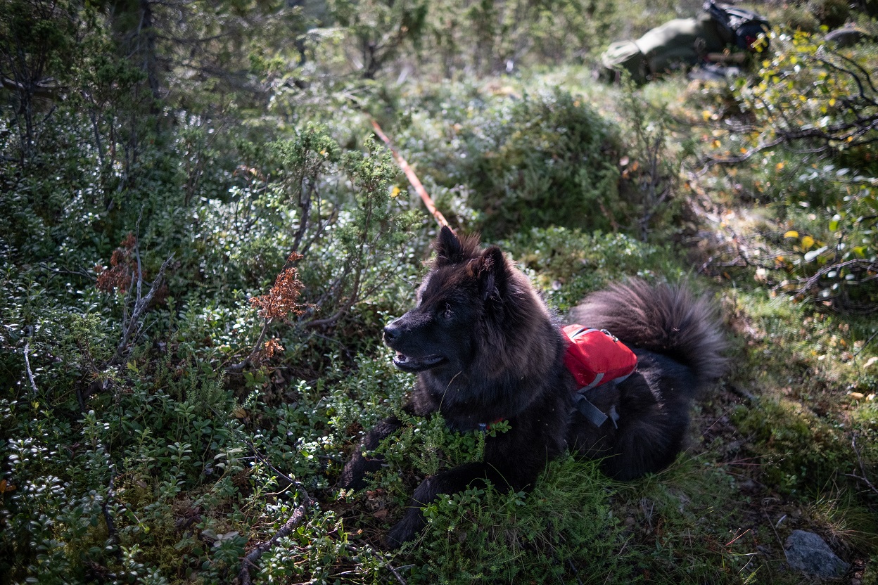 | Patikka aloiteltiin harjun päällä kulkevaa polkua pitkin Harjujärven ja Siskelijärven välistä kannasta seuraten. Polkuun yhtyy useita porojen vahvempia uria ja välillä jouduimme korjaamaan suuntaa oikean uran löytääksemme. Kuusiselän Kaakkoisreunalla on porojen valtateitä hiekkatievoilla, jonne asti pystyy reittiä seuraamaan helpohkosti vaikka läskipyörällä halutessaan. Siitä eteenpäin alkaa suunnistusta vaativat erämaat. Reissun päätavoite itselleni oli löytää karhukammi, jonka ylimalkaisen sijainnin löysin netin kautta, mutta tarkempi sijainti oli täysi mysteeri. Kuljimme kohti Sarmikuusikkoa ja yhtä olettamaamme paikkaa, josta kammia voisi yrittää etsiä. Haravoimme aluetta välillä ilman rinkkojakin, mutta totesimme työn tuloksettomaksi ja vaihdoimme etsinnän telttapaikan haeskeluun.Sopiva paikka löytyi Kivijoen läheisyydestä korkealta penkalta, jossa oli pidetty tulia paljon aikaisemminkin. Lyyti ilmaisi selkeästi, että olisi vielä voinut jatkaa pidemmälle ja purki turhautumistaan pureskelleen juurakoita ja piilotellen syötäviksi annettuja herkkuluita. Aamupäivä oli kolea, mutta illaksi keli tuntui hieman lämpenevän ja kunnon tervastuli piti loppuillan tunnelmasta huolen. Tällä kertaa mukana oli vain valmisruokia pusseissa ja ensimmäinen oli pohjanoteeraus sekä maultaan, että rakenteeltaan. Keltainen mössö hieman imelällä sivumaulla jääköön pois jatkossa listoilta. Lyyti hieman protestoi telttaan menoa, mutta rauhoittui kuitenkin aika nopeasti unille. Meillä molemmilla jostain syystä vajuivat yön aikana Expedin untuva-alustat ja selkä otti kiinni teltan pohjaan aamulla. Seuraavina öinä pumpattiin patjat aivan täyteen ja ne piti ilmat paremmin sisällään. |