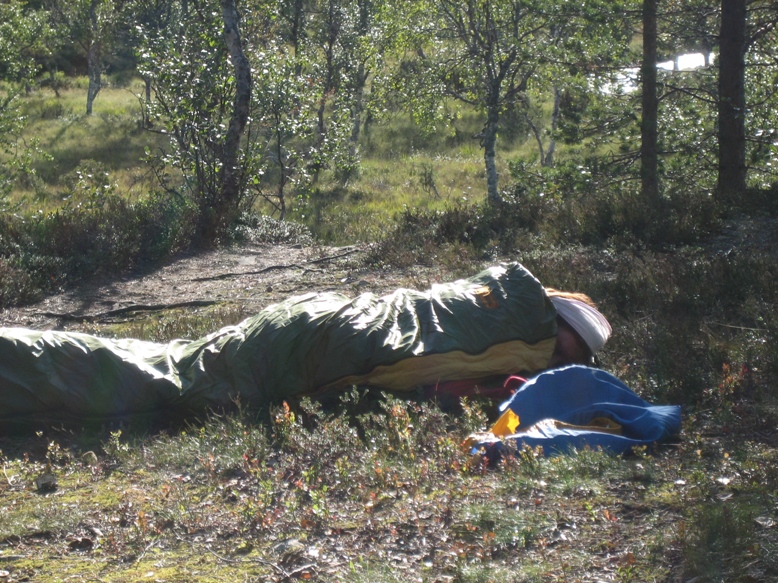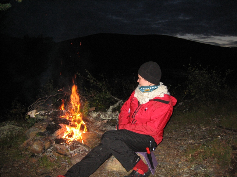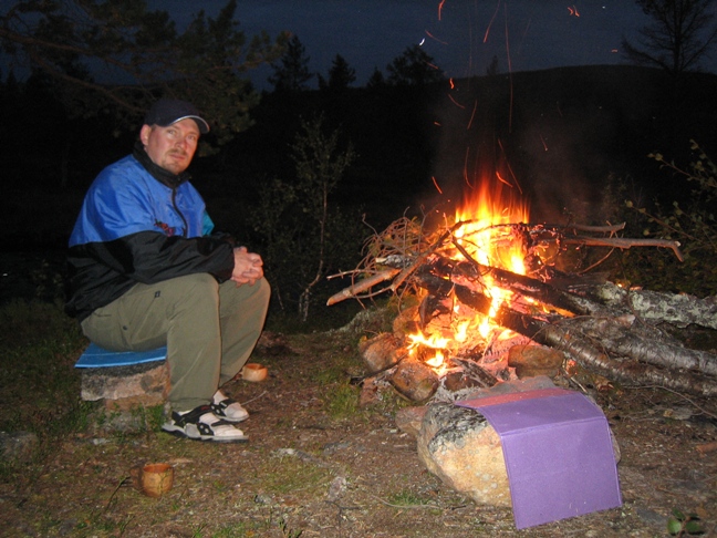Tahvontupa - Vongoivan kammi - anterijoki Uusi aamu aukeni upean aurinkoisena. Aamupuuhissa meni aika pitkään ja kun viimein saimme itsemme taipaleelle, kirposi hiki otsalle saman tien. Reissun lämpimin päivä oli tarkoitus päättää Anterijoen maisemiin. Valitsimme jälleen omia polkuja kulkevan reitin Vongoivan kammille. Kammia ennen löytyi mukava puronvarsikallio, jossa valmistelimme lämpimät kupit lisukkeineen. Ihmettelimme porojen vähyyttä, koska emme olleet nähneet vielä ainuttakaan, edes automatkalla. Lopulta tunturin rinteellä loikoili 3n poron seurue ja usko poron olemassaoloon jälleen vahvistui. Vongoivan kammi on upealla paikalla ja kateeksi kävi hieman sen varanneita, kun jouduimme jatkamaan matkaa eteenpäin. Ylitimme tunturin notkelman kahden huipun välistä ja suuntasimme kohti anterijokea. Kävimme vieä kurkistamassa tunturin rinteeseen syöpyneen lohkarekurun, on siinä joskus vesi virrannut. Löysimme Metsähallituksen ylläpitämän tulipaikan, mutta siihen kävi tuuli sen verran kovaa, että jatkoimme kohti anterin latvoja. Mutkan takaa löytyikin varsin kiva paikka, johon tosin tulipuiden etsiminen kävi työstä. Kunnon tulet saatuamme oli aika koekalastella anterijokea, tyhjää täynnä tuntui matala puro olevan. Illallisen päälle tuhosimme suurimman osan vodkasta ja se taisikin lämmittää enemmän kuin nuotio. Teltassa uni maistui mainiosti ja heräsimme vasta 10 maissa aamulla. |