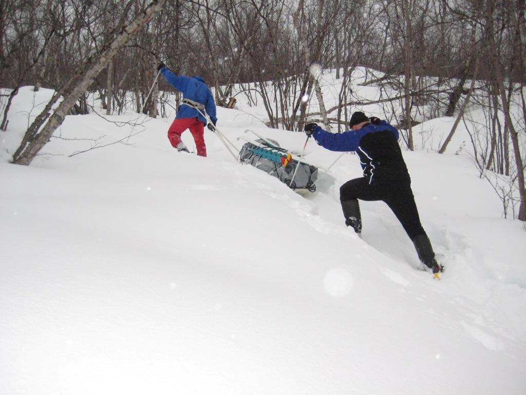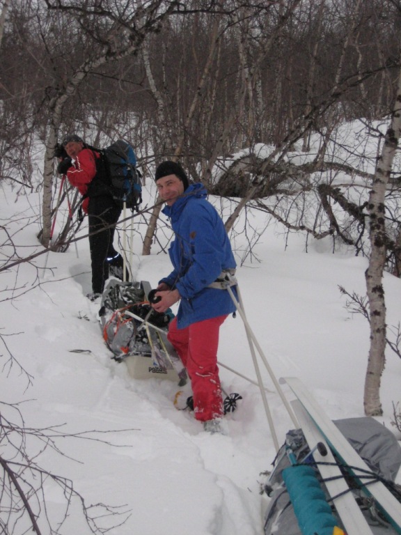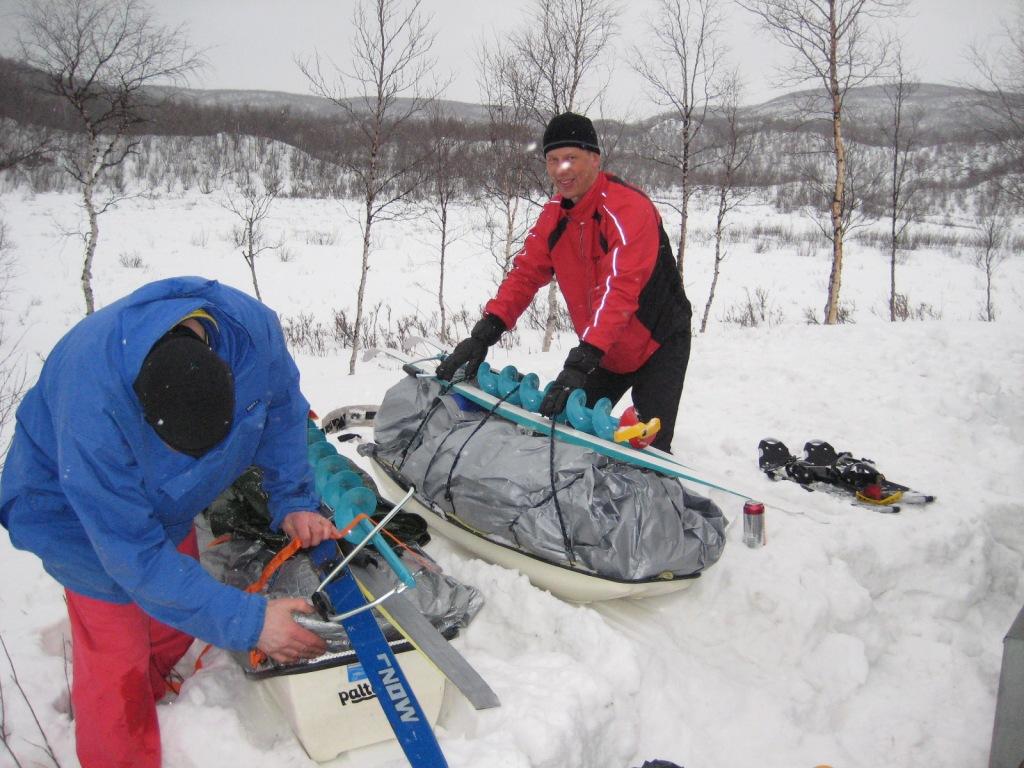Ajelimme Utsjoelle ja Uulan Säästöstä vielä katkaravut syöteiksi ja muutakin viime hetken ostosta tarttui mukaan. Tenon yli Norjan puolelle, josta seurailimme Tenovartta jonkin matkaa etsien autolle edelliseltä reissulta tuttua pysäköintipaikkaa. Auto parkkiin ja tavaroiden purku kärrystä ja pakkaus ahkioihin kirvoitti ensimmäiset hikipisarat otsalle. Keli oli pakkasella pari astetta ja ilma pilvinen. Heti ensimmäiset askeleet lumikengillä paljastivat edessä olevan raskaan osuuden nousta ylängölle tunturikoivujen peittäämää rinnettä. Lumi oli hienojakoista ja upotti liki pohjia myöten. Odottelimme ensimmäisen nyppyrän päällä Mattia saapuvaksi ja kun miestä ei alkanut kuulua, kääntyi Jouko kuulostelemaan tilannetta. Selvisi, että Matin hieman lyhytmallinen ahkio ei halunnut kulkea pystyssä, vaan kellisti muutaman metrin välein jommallekummalle kyljelleen. Päätimme jatkaa siten, että vikuroiva ahkio eteni ensimmäisenä, jotta perässätulija pystyi oikaisemaan kaatuneen ahkion. Homma toimi ensimmäiseen suurempaan rinteeseen, jossa huomattiin, että tässä kelissä ja varsinkaan näin painavat ahkiot perässä ei yhden miehen voimat riittäneet etenemiseen. Lumikengät jauhoivat tyhjää, kunnes varvikko tuli vastaan, joten ainoa mahdollisuus oli irroittaa oma ahkio ja auttaa edellä menevää rinteiden päälle ja kääntyä hakemaan kahden miehen voimin seuraava ahkio. Etenimme ensimmäistä kilometriä noin kolme ja puoli tuntia. Tämä söi voimia niin rajusti, että jouduimme tekemään tulet rinteeseen ja pistelemään ruokaa ja juomaa poskeen ihan kunnolla energian takaisinsaamiseksi. Olin tehnyt ahkioon vetovyön ostamastani painonnostovyöstä, johon kiinnitin sivuille metalliset lenkit. Lenkit vahvistin ja suojasin ilmastointiteipillä, sekä rautalangalla. Viritys toimi hyvin, eikä rikkoutunut rajummassakaan menossa. Jouko oli tehnyt uudet aisat tukevasta narusta ja sähköputkesta. Jokaisen ahkion osalta saimme viimeistään paluumatkalla muoviputken tai molemmat poikki, mutta se ei menoa onneksi paljon haitannut. |