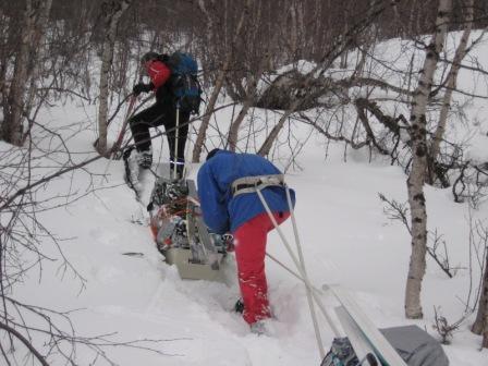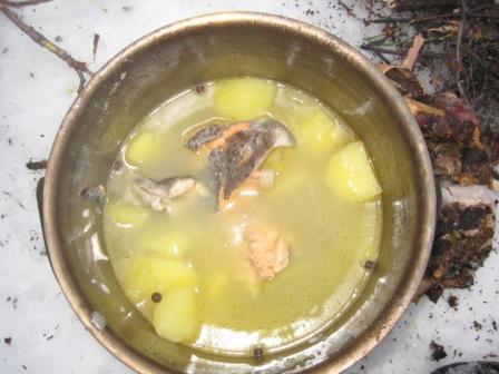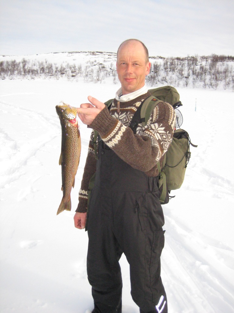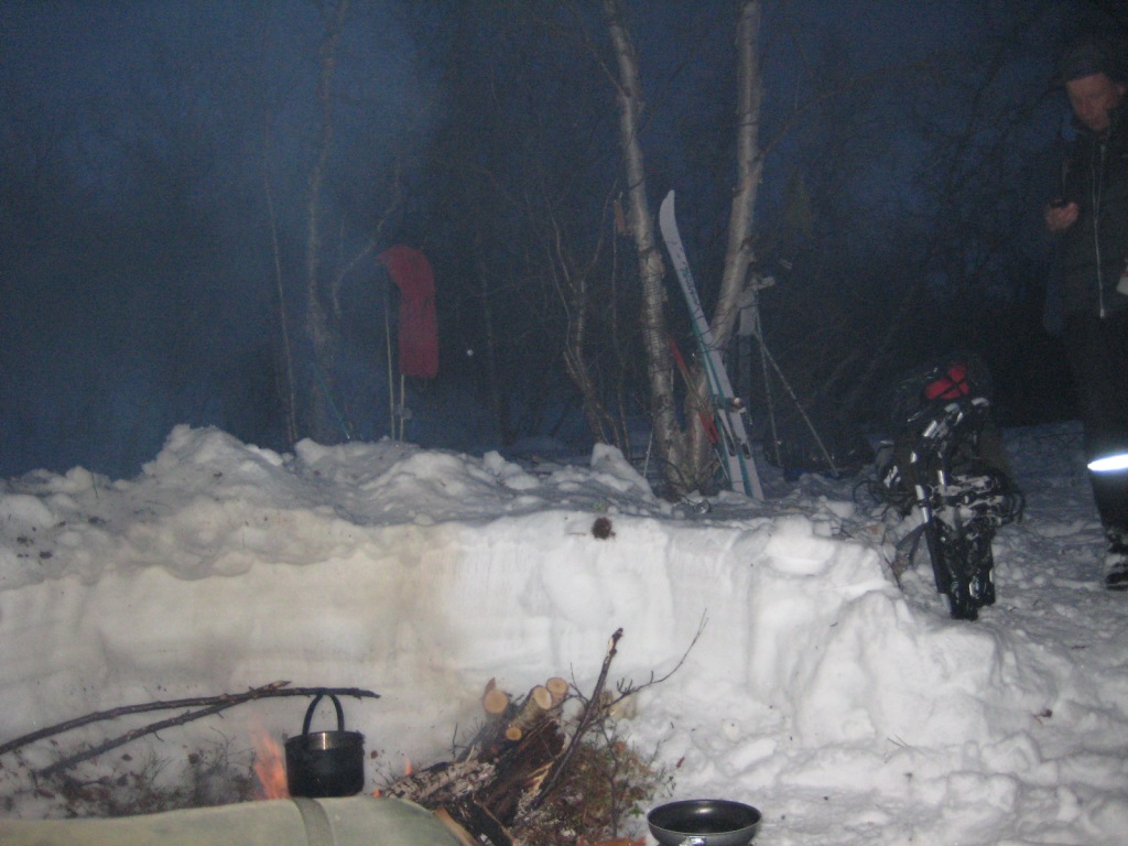 Oletimme yhden lammen ehkä olevan se missä olimme ja lähdimme jälleen kohti ylänköä ja nyt vakaasti suunnalla ja mittaamalla matkaa. Luottamus kuitenkin petti jälleen ylängöllä, vaikka olimme jälkikäteen katsottuna ihan oikealla suunalla ja vain muutaman sadan metrin päässä järvestä. Niinpä jälleen muutimme suuntaan kohti itää. Horisontissa näkyi jokin järven näköinen ja porukalla päätimme edetä kohti pohjoista niin pitkään kunnes jokin vesi tulee vastaan, jotta pääsisimme edes toisen päivän päätteeksi uittamaan pilkkejämme. Puolen tunnin tallaamisen jälkeen yht'äkkiä rinteen reunustassa näkyi järvi, jota kohti suuntasimme. Matti ja Jouko innokkaina kalamiehinä kairasivat heti reiät jäähän ja samalla Matti kaivoi kartan esiin ja tuumaili, että jotain tuttua tässä on. Matti Kysyi Joukoa hiihtämään seuraavan rintauksen taakse katsomaan onko siellä toinen järvi. No olihan siellä ja lopulta 20 tunnin rankan ahkion kiskomisen jälkeen näkyi helpottuneita ja iloisia ilmeitä kasvoilla. Suuntasimme saman tien kohti tuttu järveä ja valitsimme leiripaikaksi pohjoisrannan poukaman, johon aamuaurinko mukavasti pääsisi paistamaan. Matti & Jouko suuntasivat kohti edelliskerran ottipaikkoja, eikä siinä pitkään mennyt kun kiloinen taimen oli jään paremmalla puolella. Tämä taimen pääsi fileiksi ja suolakalaksi. Etsimme järven rantapensaikosta sopivia maapuita, sekä pystyyn kuolleita koivuja, joista pitkällisen työn jälkeen saimme loihdittua pysyvät tulet. Matti sai muutaman pienemmän taimenen ja niistä keittelimme todella maistuvan kalakeiton. Perunoita, 5 taimenta, voita, pippuria ja suolaa, muuta ei tarvittu. |