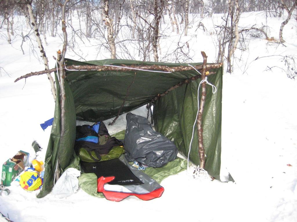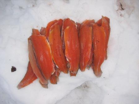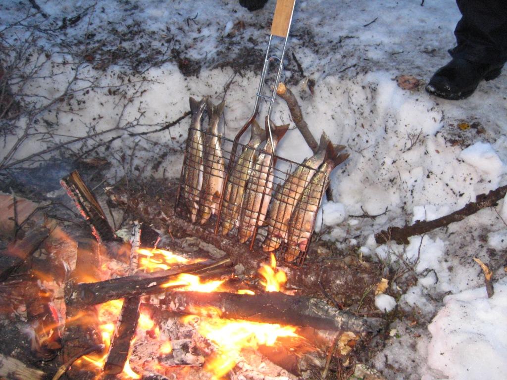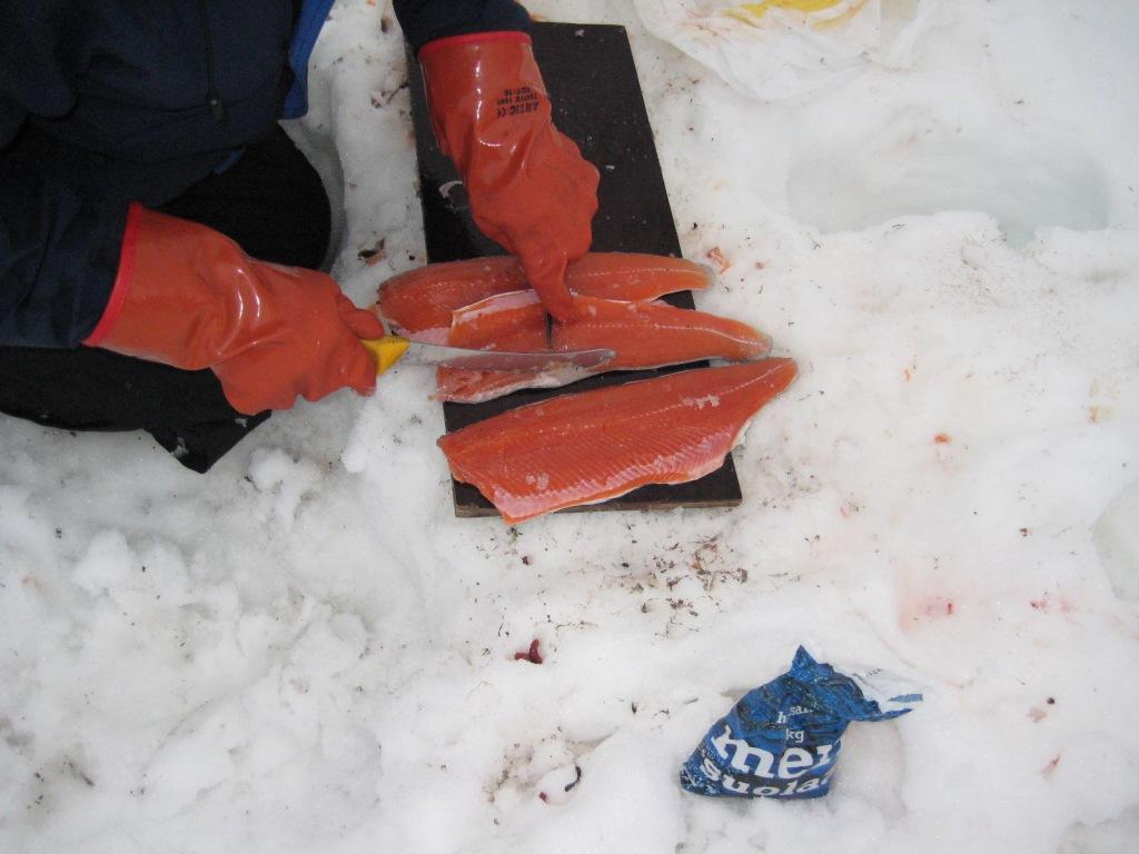 Nukuin yli kahdeksaan ja ilmeisesti ainakin pari tuntia oli pilkit jo lionneet järven ottipaikoilla veljesten toimesta siihen mennessä. Taimenia oli tullut tasaiseen tahtiin niin pilkeillä kuin ootto-ongillakin. Kalat ottivat ahnaasti ja pilkkejä sai kaivella lähes mahasta asti pihtien voimin. Tämä päivä käytettiin voimien palautumiseen ja oltiinkin kotijärvellä koko ajan. Minä yritin etsiä uusia ottipaikkoja järven itäpäästä ja eteläreunalta ilman mainittavia tuloksia. Muutamia nykyjä kävi, mutta vähäinen pilkkikokemus taisi kostautua karanneina kaloina. Onneksi kaloja oli tullut sen verran muiden toimesta, että osa päätyi suolattuna astiaan ja hangen syleilyyn ja 11 kauneinta saivat halsterissa kypsyä illalliseksi. Ilta oli hieman viileämmän tuntuinen kuin edelliset ja yöllä kävikin ihan napakka pakkanen vierailulla. Huomasin, että yli 15 vuotta vanha ajungilak ei enää pidä lämpöä yllä entiseen malliin, koska heräilin vähän väliä kylmän puistatuksiin. Osasyynä oli kyllä laavun reipas ilmankierto ja napakka tuuli, joka ravisutti kevytpeitettä aika äänekkäästi koko yön. |