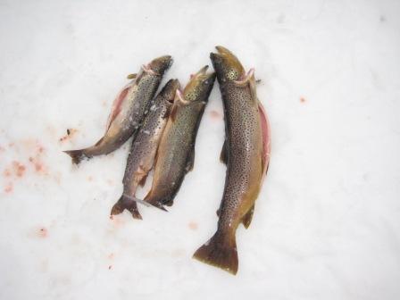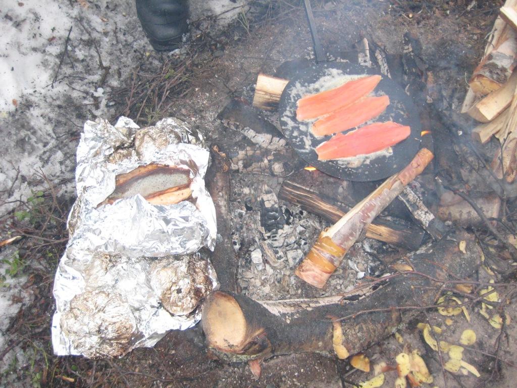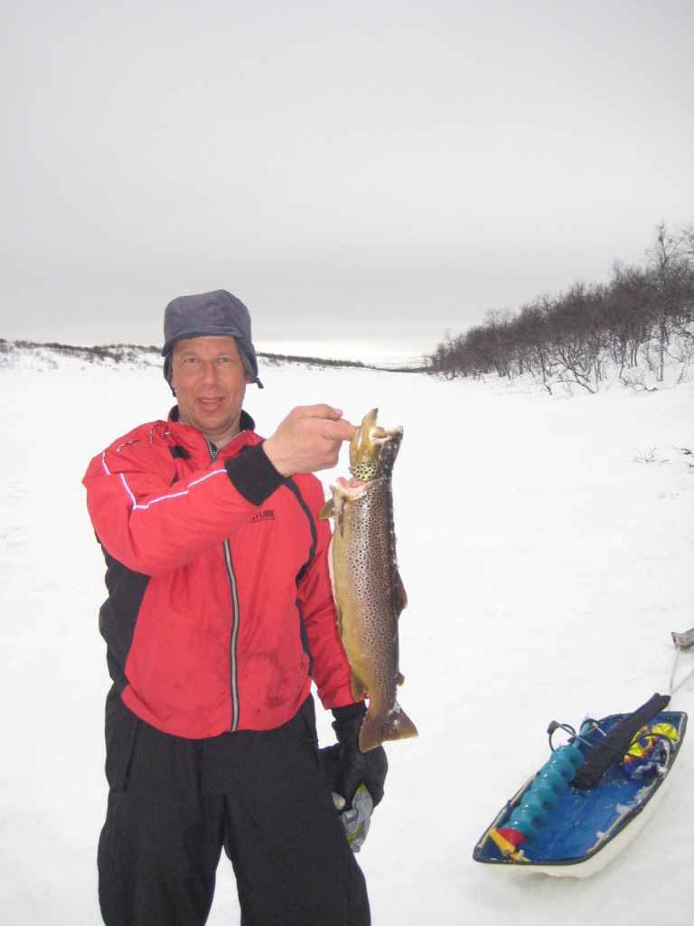 Edellisen illan tulilla jo päätimme, että Joukon kanssa lähdemme aamupalan jälkeen kilometrin päässä sijaitsevalle järvelle, joka kartan perusteella näytti lupaavalta. Otimme termospulloihin kuumaa teetä ja muutamat eväsleivät ja ensimmäistä kertaa tällä reissulla saivat suksetkin töitä. Yöllä oli muodostunut hieman hankikantoa ja ahkiossa oli kevyt vedellä kairaa ja vaatereppua mukana. Saavuttuamme järvelle arvioimme mahdolliset ottipaikat ja suuntasimme jyrkimmän rinteen suuntaan, jonka vieressä järveen pisti niemi. Kairasin muutaman reiän rannan suuntaisesti ja mittasin syvyydeksi kahdesta kolmeen metriä, eli varsin otollisen iskupaikan. Heti kun ehdin laskea pienen perhokoukun katkalla maustettuna, kävi jokin ravistelemassa syöttiä, mutta ei taaskaan pysynyt kiinni. Sitten menikin pari tuntia hiljaiselolla ja kairailtiin lisää reikiä. Todella kylmä viima yltyi järven suuntaisesti ja minulla alkoi vaatteet loppua päälle laitettavaksi. Sain ensimmäisestä reiästä yhden alamittaisen taimenen, jonka laskin takaisin. Ajattelin, että ei täältä isompia tulekaan ja kun sopivasti paleli, niin lähdin leiriä kohti Joukon jäädessä vielä kokeilemaan. Saavuin laavulle ja vaihdoin kuivaa vaatetta päälle. Ajattelin ottaa pienet nokoset, mutta vaivuin syvään uneen liki kolmeksi tunniksi. Heräsin sopivasti kun Jouko saapui takaisin ja ilmoitteli, että tulehan kameran kanssa katsomaan tammukoita, joiksi olin järven kalat nimennyt. Jouko oli nostellut viisi komeaa taimenta samasta reiästä, jonka kairasin ensimmäisenä ja suurin niistä painoi 1.67 kg ja oli todella kirkkaan punalihainen. Illallinen loihdittiin tällä kertaa paistamalla taimenfilettä muurikkapannulla runsaassa voissa keitettyjen perunoiden kera. Mietiskeltiin seuraavan päivän osalta lähdemmekö noin viiden kilometrin päässä olevalle järvelle, joka oli oikeastaan alkuperäinen tavoitteemme. Päätimme jättää päätöksen aamuun, jolloin kelin näkisi parhaiten. |