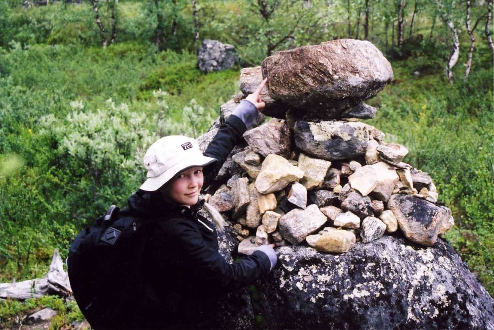 Aamulla vasta huomasin liiterissä olevan alustoja telttojen alle, mutta ei nekään olisi auttaneet kylmyyteen. Laittelimme tulet, sekä keittelimme puurot ja kiisselit kun jo ensimmäinen vaeltaja tuli Karigasniemen suunnasta joen yli. Kylmältä kuullosti vesi tuntuneen. Pakkailimme pikkuhiljaa tavarat kasaan ja lähdimme autolle päin. Polku kulkee mäen rinnettä ylös ja alas tasaiseen tahtiin ja nostaa hien rinkan kantajan otsalle. Lepäilimme tuttuun tapaan noin kilometrin välein ja matka eteni mukavasti. |