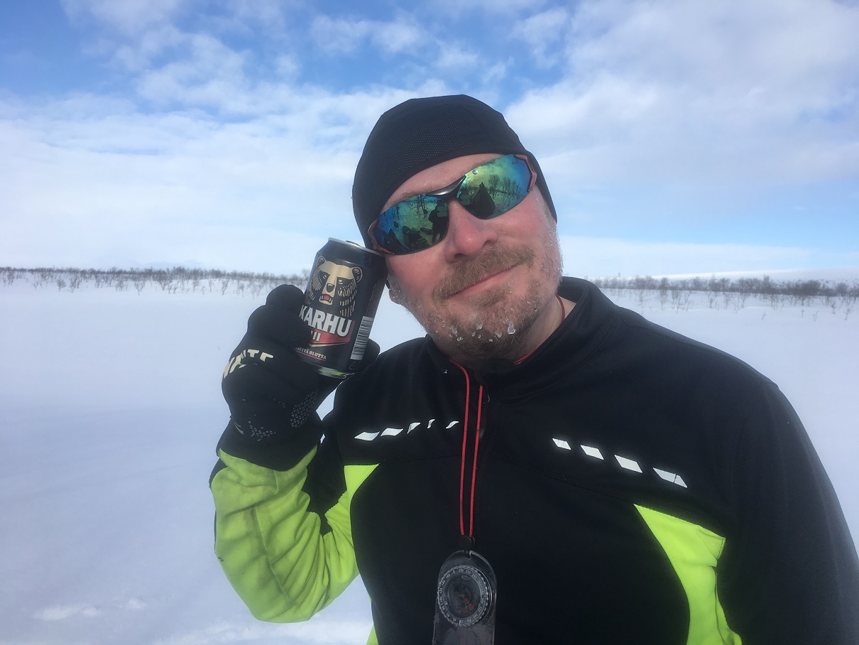 Olin etukäteen ajatellut, että joen leventymässä olevassa "järvessä" on pakko olla kalaa ja varasin tämän iltapäivän ja illan pilkkimiselle. Laitettiin kota vauhdilla pystyyn ja tein Katjalle nuotiotarpeita ison läjän Pääsiäiskokkoa varten. Täpinöissäni suuntasin lumikengät jalassa, kaira ja lumilapio olalla, kohti järven keskustaa auringon paistaessa täydeltä terältä. Ensimmäinen reikä ja mutainen pohjanäyte. Seuraavat kuusi reikää ympäri järveä ja sama homma, eli ei vettä missään. Onneksi oli pilkkirepussa kylmä olut, koska sen lisäksi, että oli karmea hiki uurastuksesta, niin oli harmituskin melkein tapissaan. Marssin takaisin leiriin, jossa Katja viritteli nuotiota metriseen hankeen kaivettuun kuoppaan. Jokainen, joka on joskus kokeillut tehdä isoja tulia tuoreesta koivusta syvään lumikuoppaan voinee samaistua pieneen tuskastumiseen. Tuli roihahtaa niin pitkäksi aikaa kun on pientä risua poltettavaksi, mutta sammua tupsahtaa varsinkin jos ei ole tuulinen keli. Pari tuntia ruokittiin tulta, jotta saimme kunnon nuotion palamaan roihuten. Monttuun tuulen suuntaan kaivettu oja olisi varmaan edesauttanut hapen saantia palamiselle. Lämmitimme nuotiolla eiliseltä ylijäänyttä perunaporkkanapaistosta ja pannulla käristyi maukkaat sisäfilepihvit. Runsaasti kastiketta lisukkeeksi ja viiniä kyytipojaksi. Jälkiruoaksi oli kuljetettu mämmikipposet, jonka päälle kermaa ja sokeria, sekä terästetyt Capuccino-kahvit vielä kuksasta perään. | ||