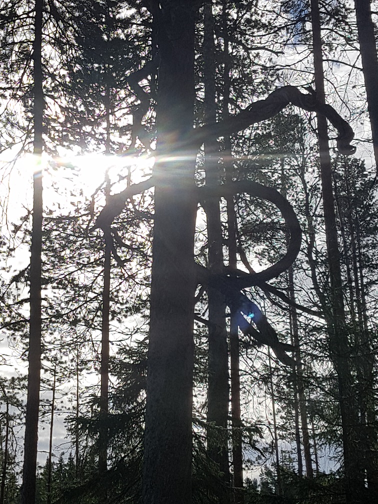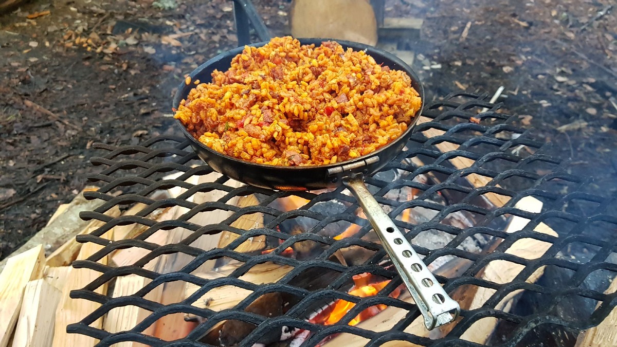 Aamu valkeni kirkkaana ja yöllä oli lämpötila käynyt nollan tuntumassa. Meillä oli molemmilla Expedin untuva-alustat ja Marmotin talviuntuvapussit, joten ainakaan kylmä ei päässyt häiritsemään. Ruusalla oli oma fleece, jonka päällä nukkui ja hyvin tarkeni. Aamiaiseksi laitettiin perjantain lounaalta jääneet hampurilaispihvit nuotiolla lämmitettyjen ruisleipien päälle. Puurot ja kiisselit kyytipojaksi kera nuotiokahvin. Suunnattiin rinkkojen pakkaamisen jälkeen kohti Koveroa vievää polkua ja heti polun alkuvaiheessa vastaan tulee todella järeitä keloja ja kilpikaarnamäntyjä. Polku erkanee oikealle ja ylittää Seitsemisjoen siltaa pitkin. Seuraavaksi vastaan tulee Haukilammen tulipaikka, jossa oli majoittuneena viiden hengen seurue modernissa sissiteltassa. Haukilammen jälkeen reitti yhtyy Koveron perinnetilalle vievään uraan. Olimme suunnitelleet täyttävämme juomapullot Koveron kaivolta, mutta vesi on ilmoituksen perusteella juomakelvotonta keittämättä, joten piti pärjätä mukana olleella vesimäärällä. Kuvailtiin hetken aikaa hienoa pihapiiriä ja jatkettiin sitten Multiharjun aarnialueen kiertävälle polulle. Komeaa vanhaa metsää ja upeasti kelottuneita ikihonkia. Marssimme Jokiristin tulipaikalle lounaan tekoon ja lounaaksi keiteltiin iso kattilallinen pastaa. Paistinpannulla ruskistelin ison pilkotun sipulin ja runsaasti valkosipulia. Pekonia ja iso kimpale savustettua kinkkua silputtuna voissa paistettuna. Ainekset kahteen kattilaan ja sekaan pari raakaa kananmunaa per kattila, sekä pippurimaustettua ruokakermaa purkillinen. Päälle kunnon kasa parmesaanisiivuja ja ääntä kohden. Vieressä ruokailuamme seuranneilla sisaruksilla oli hernekeittoa ja kasvissosekeittoa ja hieman taisi näkyä ruokakateus silmäkulmassa. Muutaman yön reissulle jaksaa kantaa myös sulan maan aikaan hieman luksusta. Illoille oli varattu punaviiniä ja valkoviiniä, joka alkaa olla hieman siinä rajoilla. Jatkettaessa kohti Liesijärveä tulee matkalla vastaan hieno entisöity vesikäyttöinen mylly, jota pääsee katsomaan sisältäkin päin.