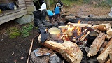 | Aamulla kajakkimies lähti jatkamaan laskujaan ja me pakkailtiin tavaramme autoon ja lähdettiin hakemaan toista autoa luontokeskukselta. Nautiskeltiin munkkikahvit ja kurkattiin näyttely ennen siirtymää Helvetinjärven puiston puolelle. Koko ajomatkan sateli vettä hiljakseen, mutta kun saatiin auto parkkiin Haukkajärven parkkiin, niin sadekin sopivasti hiljeni. Kilometri Haukkajärveltä Helvetinkolun suuntaan oli reitti poikki joen tulvittua sillan yli. Heitettiin kengät jalasta, käärittiin lahkeet ylös ja jääkylmään veteen kahlaamaan. Mukavasti alkoi veri kiertämään jaloissa kun päästiin toiselle puolelle. Otettiin vähän näkkäriä ja kinkkua näköalapaikalle rakennetulla ruokailuryhmällä ja samalla kuultiin kuinka yhtä aikaa parkkipaikalle saapuneet Espanjalaiset saapuivat joelle. He kääntyivät pitkän äänekkään pähkäilyn jälkeen takaisin. Jatkoimme lounaan tekoon Iso-Ruokejärven tulipaikalle ja sieltä oli juuri lähdössä myöskin sissiteltan kanssa liikkeellä ollut seurue. Tulipaikan kaikki polttopuut olivat märkää leppää. Puut piti pilkkoa todella pieneksi tikuksi, jotta sai edes jonkinlaisen tulen aikaiseksi. Kasattiin nuotion viereen puita kuivumaan iltaa varten, mutta nuotio meinasi hyytyä heti kun sitä ei ruokkinut ohuella tikulla. Jani laittoi lounaaksi kuivatusta jauhelihasta ja perunamuussista sekoituksen ja oikein maukkaan sellaisen. Päivän ja illan mittaan jonkin verran porukkaa kävi makkaran paistossa. Sadekuurot ja formuloiden seuraaminen viivästytti meidän jatkamista sen verran, että päätettiin jäädä yöksi ilman kiireen tuntua. Penalaavu pystyyn ja nuotiolle istumaan. Illalliseksi oli Janin esivalmistama herkullinen paella ja alkupaloiksi Tapaslajitelma. Juomana valkoviiniä ja muutama olutkin taisi vielä repun kätköistä löytyä. Onneksi "Paapanvesi" jäi pitkälti nauttimatta. Jani onnistui nappaamaan sateen jälkeen muutaman hienon otoksen sumuisesta järven pinnasta kuun alkaessa nousta horisontista. Aamuyön puolella nukkumaan.