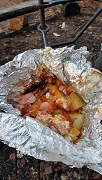 | Yöksi meillä oli tavoitteena Liesijärven laavu tai telttapaikka, mutta lounaalla ollut kaksikko oli aikeissa mennä sinne myös ja Liesijärveä lähestyttäessä sieltä kuului jo usean seurueen ääniä, jolloin turvauduttiin varasuunnitelmaan. Matka liesijärvelle oli todella märkää paikka paikoin ja onnistuin kastelemaan matalat vaelluskenkäni käytännössä läpimäräksi. Katsottiin kartalta, että pienen ajomatkan päässä olisi Rysäslammin laavu, joten suunnattiin liesijärven lähelle jätetyllä autolla sinne. Laavu on melkein metsäautotien varressa ja oli tyhjillään. Polttopuuhuoltoa laavulla ei ole ja puut olivat vähissä. Saatiin kuitenkin jämistä pilkottua nuotio kasaan ja kostuneet sukat ja kengät kuivumaan. Viereiseltä vuokramökiltä alkoi kuulumaan uskomaton älämölö ja hetken mietittiin vielä paikan vaihtoa. Onneksi mökin porukka taisi joko nukahtaa tai siirtyä sisätiloihin ja päätimme jäädä siihen yöksi. Välipalana nautittiin Pielisen savumuikkuja, poronpaistisiivuja ja parmesaania. Illalliseksi tehtiin Fajitaksia, joihin oli esivalmistettu kanasuikaleet mausteseoksessa.Pilkottiin paprikaa ja sipulia, sekä parmesaania ja olihan mukana toki purkillinen smetanaa, sekä chilitahnaa. Lettu lämpimäksi teflonpannulla nuotiolla ja täytteet sisään. Hyviä olivat. Onnistuin mystisesti polttamaan sukkani ruokailun yhteydessä ja niistä ei jäänyt kuin pieni tuhkaläjä pölkyn päälle. Onneksi oli varavaatekerta matkassa. Tyhjenneltiin pieni Jallupullo ennen nukkumaanmenoa ja taisi siinä minttukaakaotkin mennä yksin tein. Olimme jo nukahtaneet kun laavulle saapui hämärissä kajakilla koskia laskemassa ollut nuorimies. Aamuyöstä teeret kukersivat niin kovaan ääneen läheisellä suolla, että kuullosti ihan kuin ne olisivat olleet aivan laavun nurkalla.